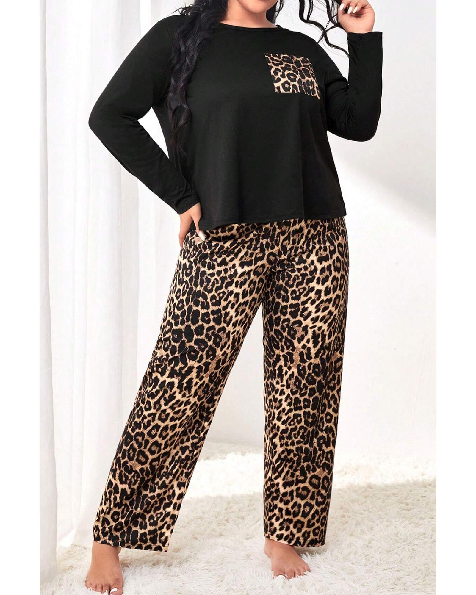 This stylish plus size set features a trendy leopard print design, combining a long sleeve top and pants for a fashionable and comfortable look. The full-length design makes it suitable for fall and winter seasons, while the patched pocket adds a unique detail. Crafted with high elasticity, it ensures a comfortable fit for everyday wear.