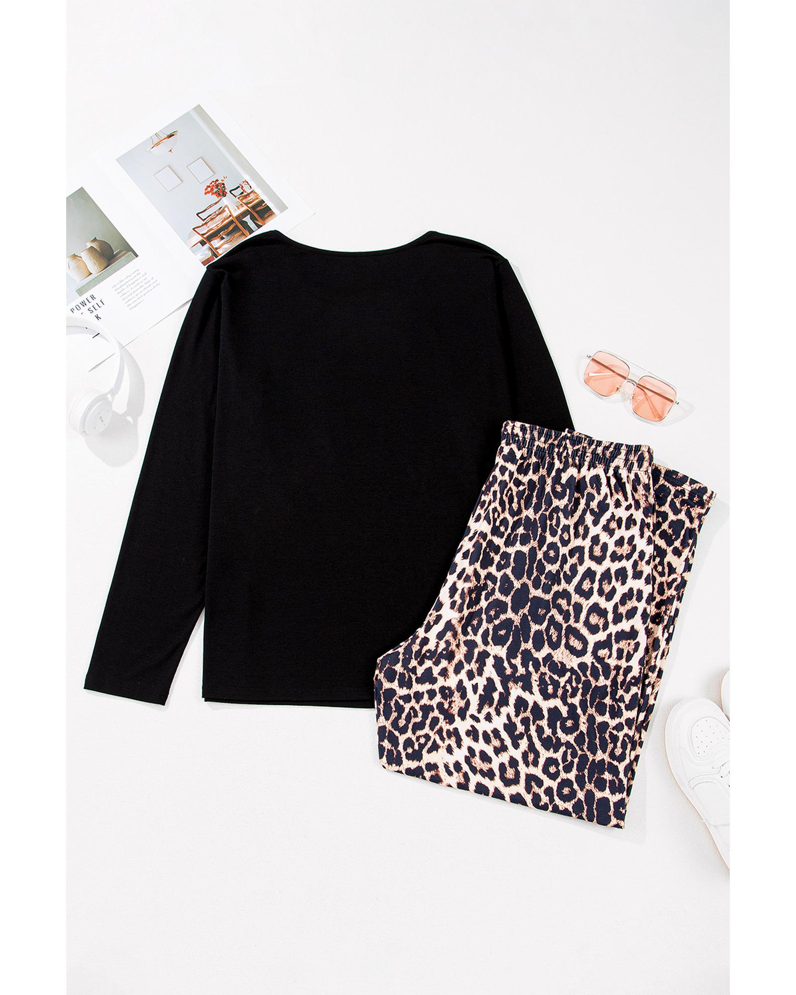 Black Leopard Patched Pocket Long Sleeve Top Plus Size Pants Set – 3X