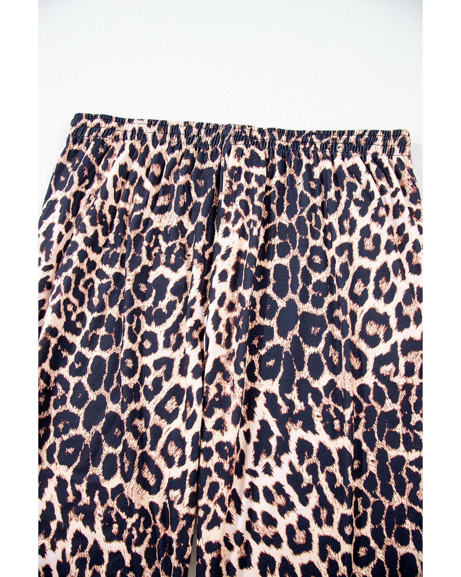 This plus size long sleeve top and pants set features a trendy leopard print design, offering a bold and fashionable look suitable for fall and winter seasons. The set is designed for comfort and style, with a high elasticity fabric that provides a comfortable fit. It includes a patched pocket detail that adds a touch of style to the overall look.