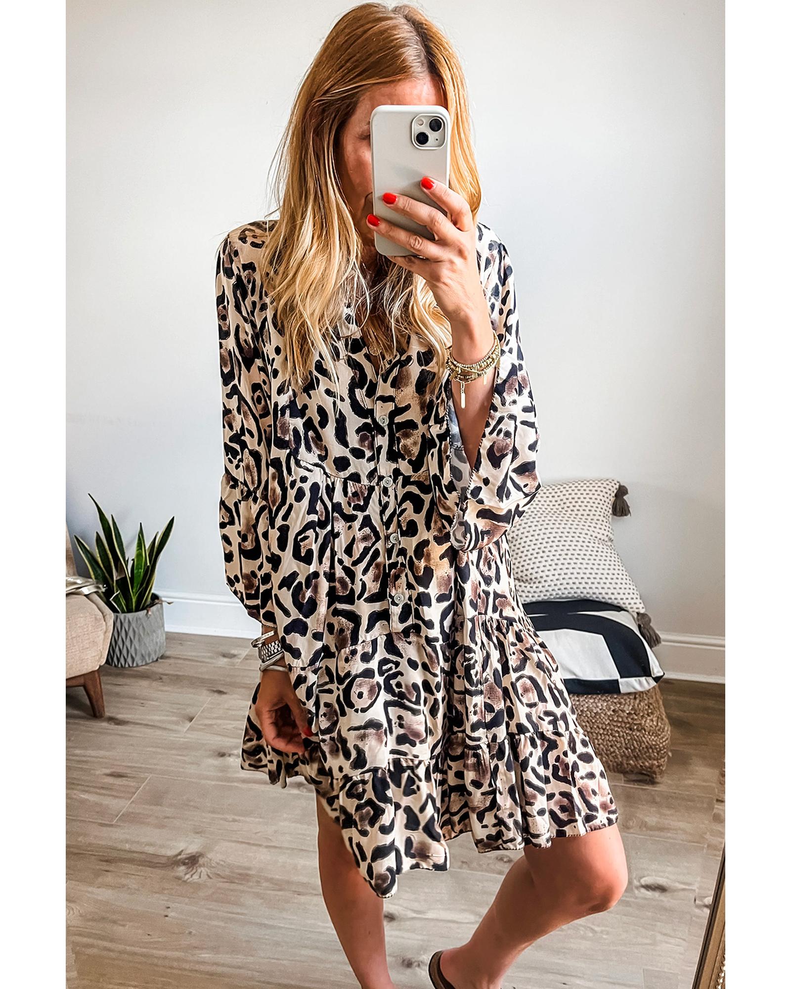 Black Leopard Print Buttoned Front 3/4 Sleeve Tiered Ruffled Hem Dress - M Original price was: $76.99.Current price is: $41.99.