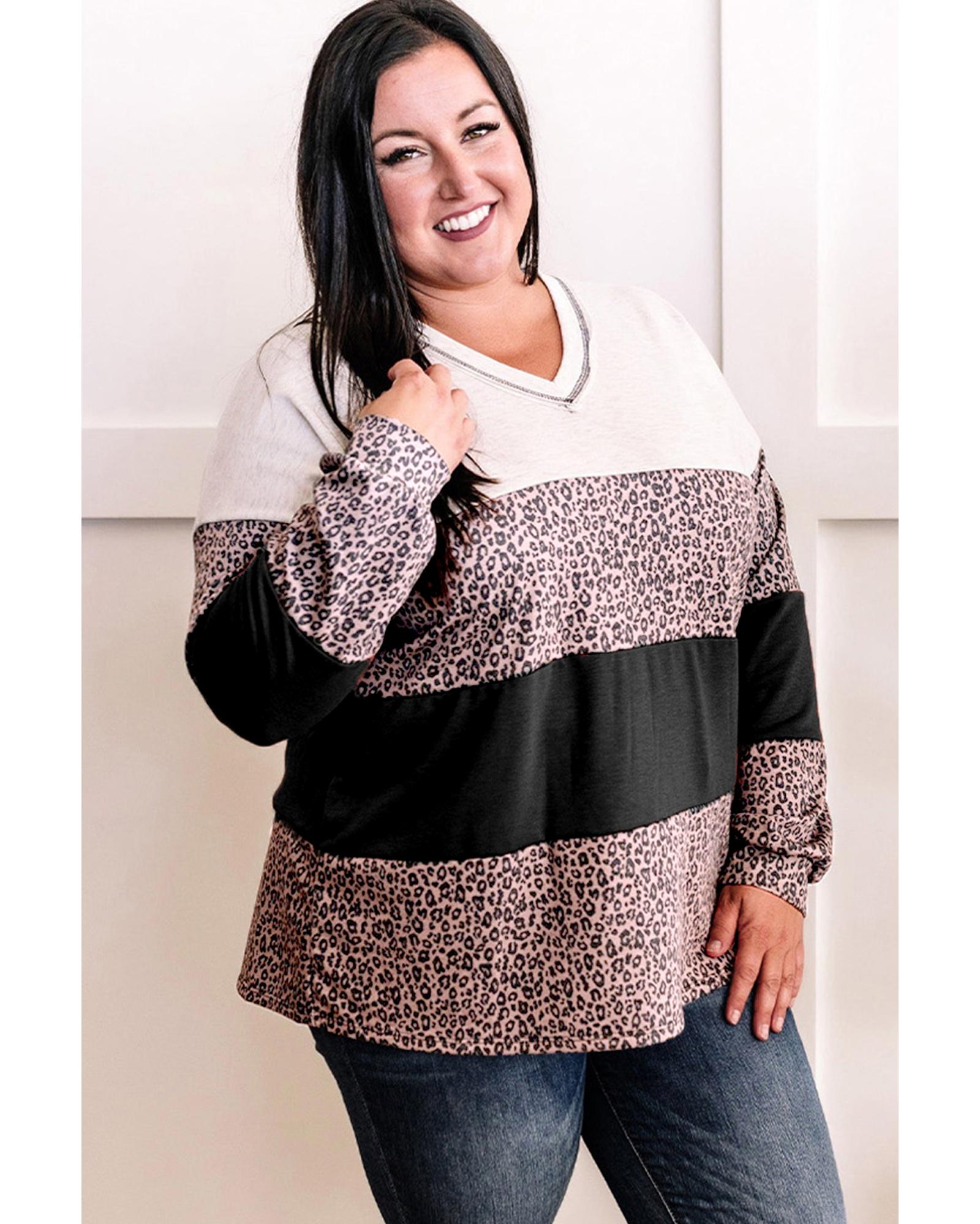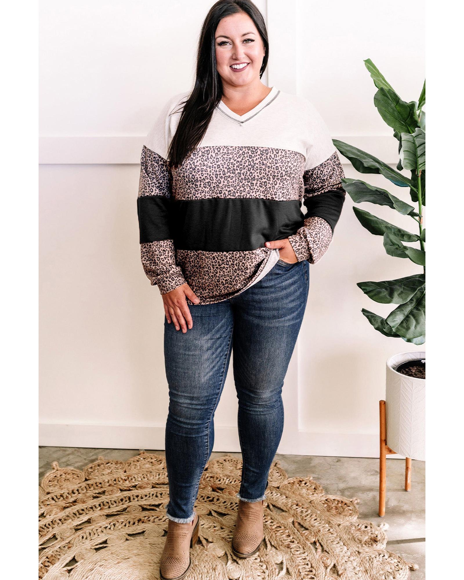 This stylish plus size top features a bold leopard print combined with a colorblock design, creating a striking and fashionable look. The V neckline enhances a slimmer face shape, while long sleeves add comfort and versatility. Designed with a trendy fitted silhouette, it offers a comfortable and stylish fit suitable for various occasions.