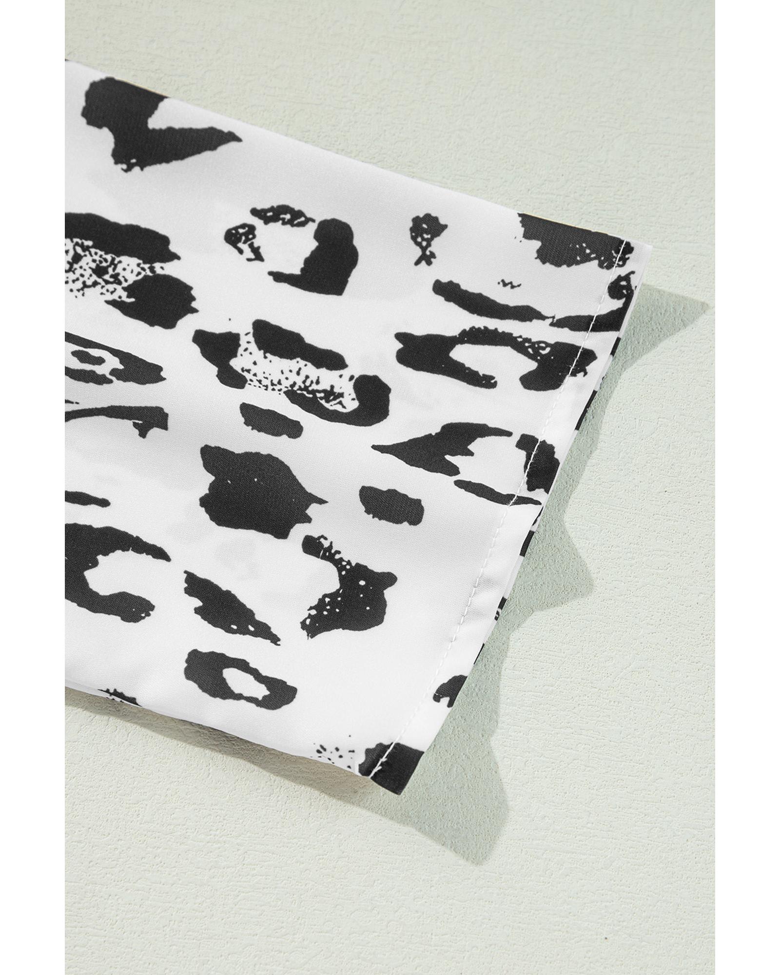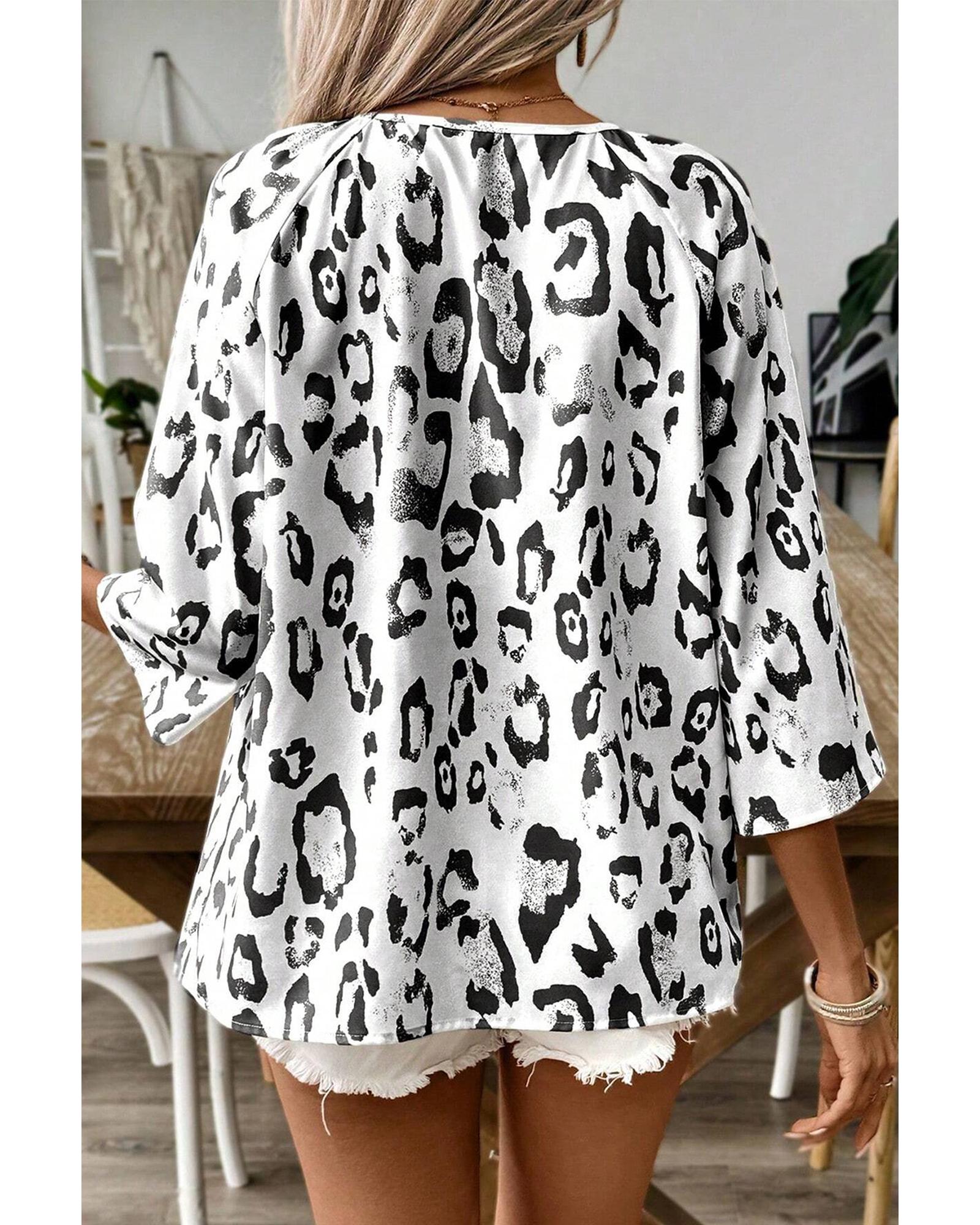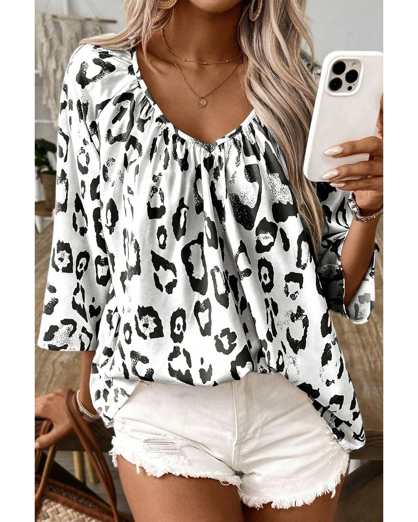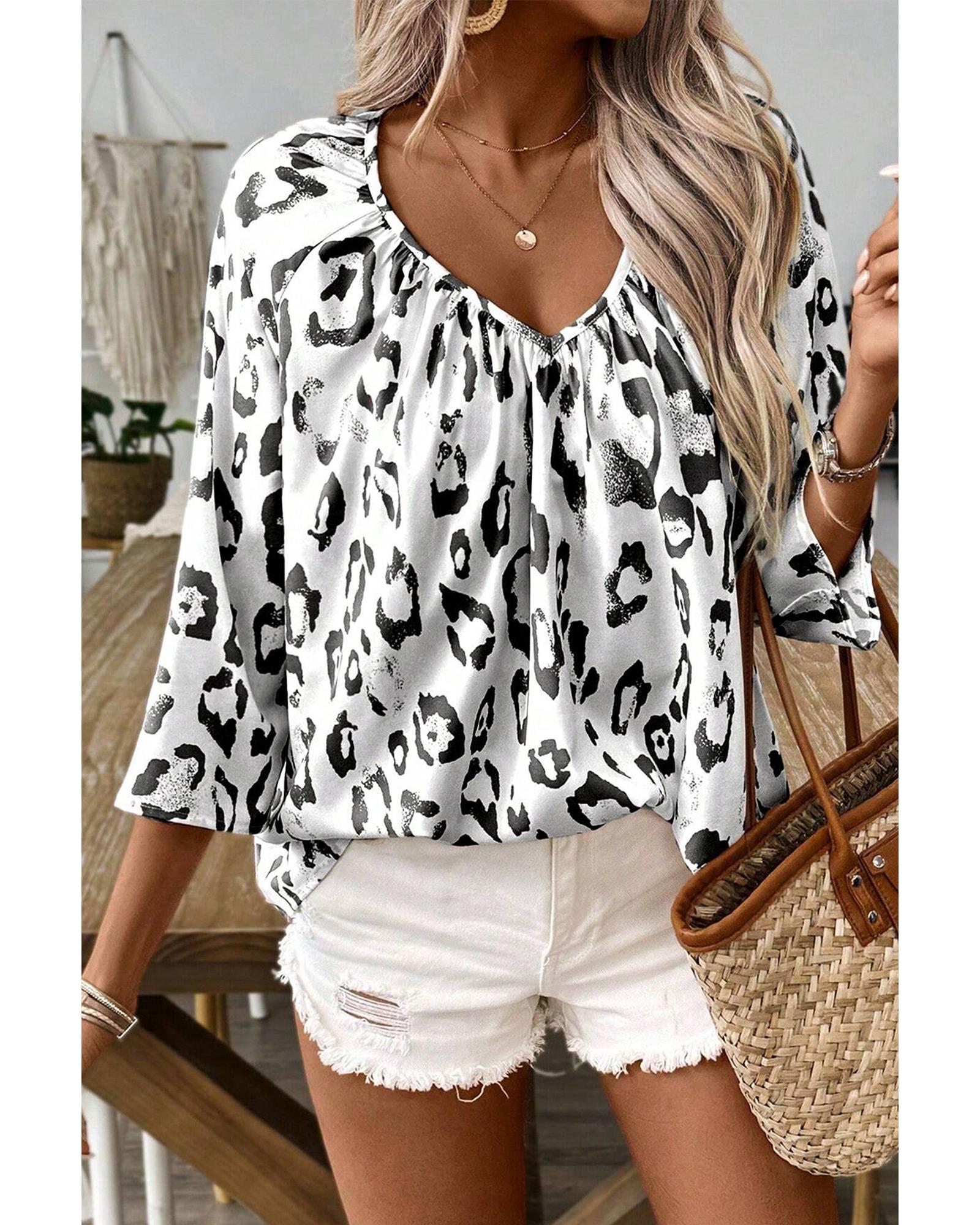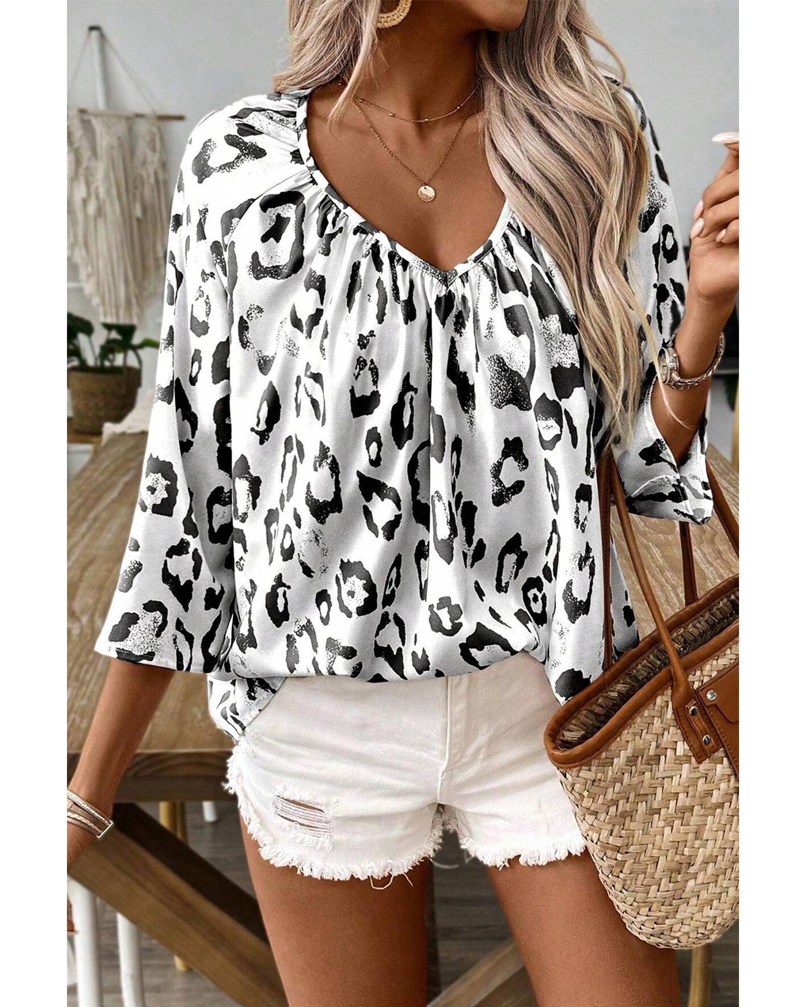 This blouse features a bold leopard print design with a ruched V-neckline and 3/4 sleeves, creating a fashionable and sophisticated look. Its fitted silhouette offers a trendy appearance suitable for various occasions, making it a versatile addition to your wardrobe.