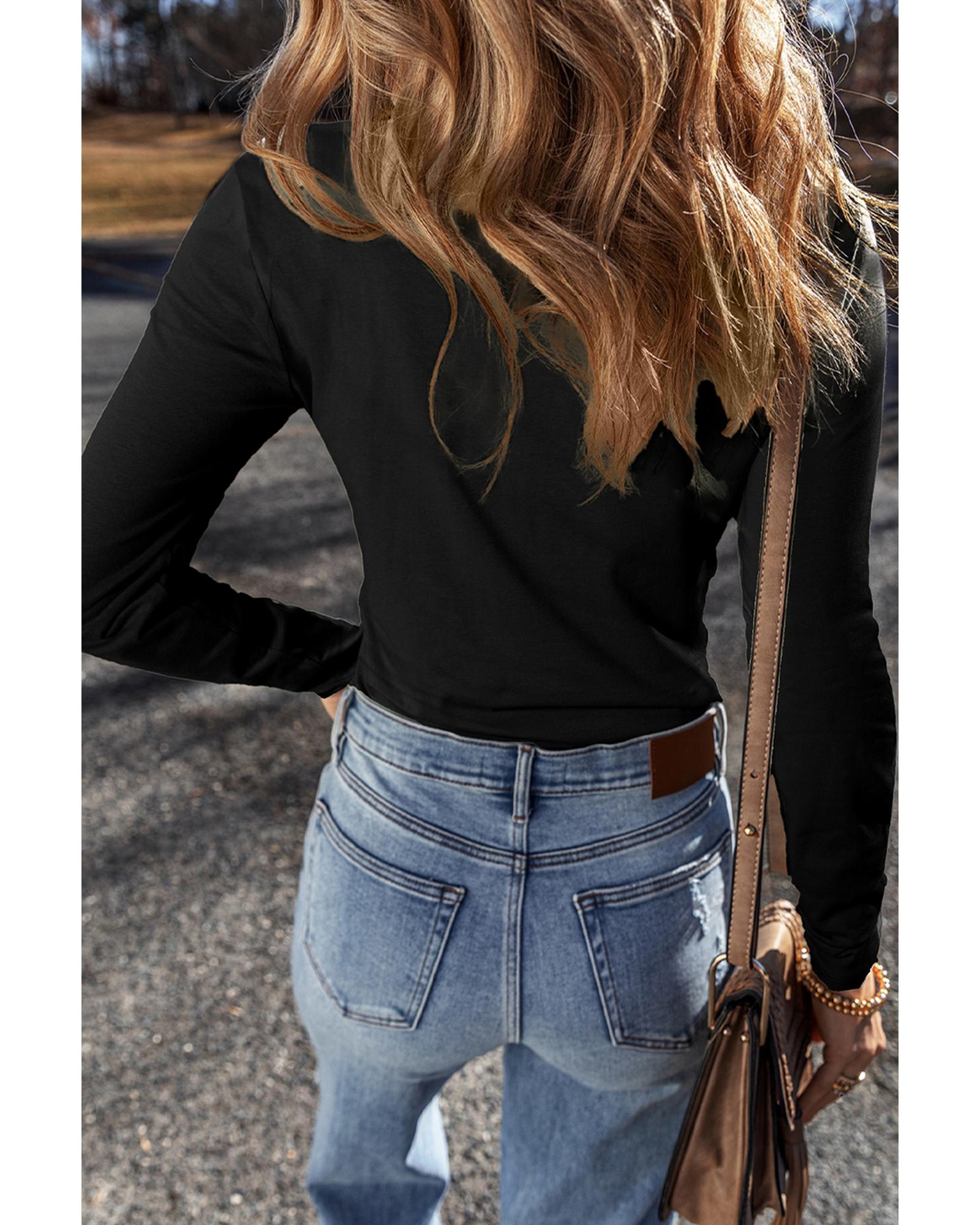 This black long sleeve top features a V neckline and a slim fit silhouette, designed to flatter the curves and add a touch of allure. Its simple, solid color and chic design make it versatile for various outfits, whether layered or worn alone.
