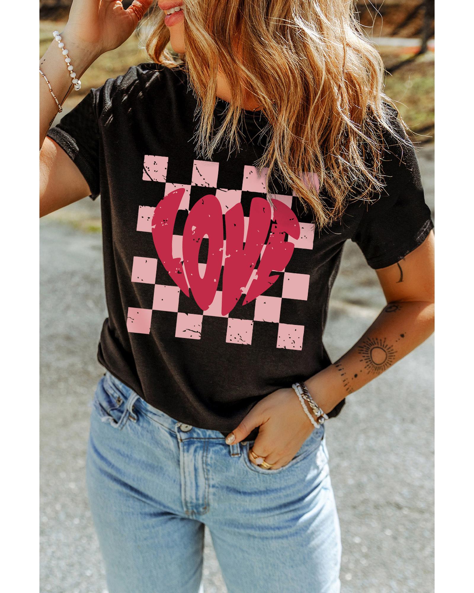 • Black checkered graphic T-shirt with LOVE lettering and heart design
