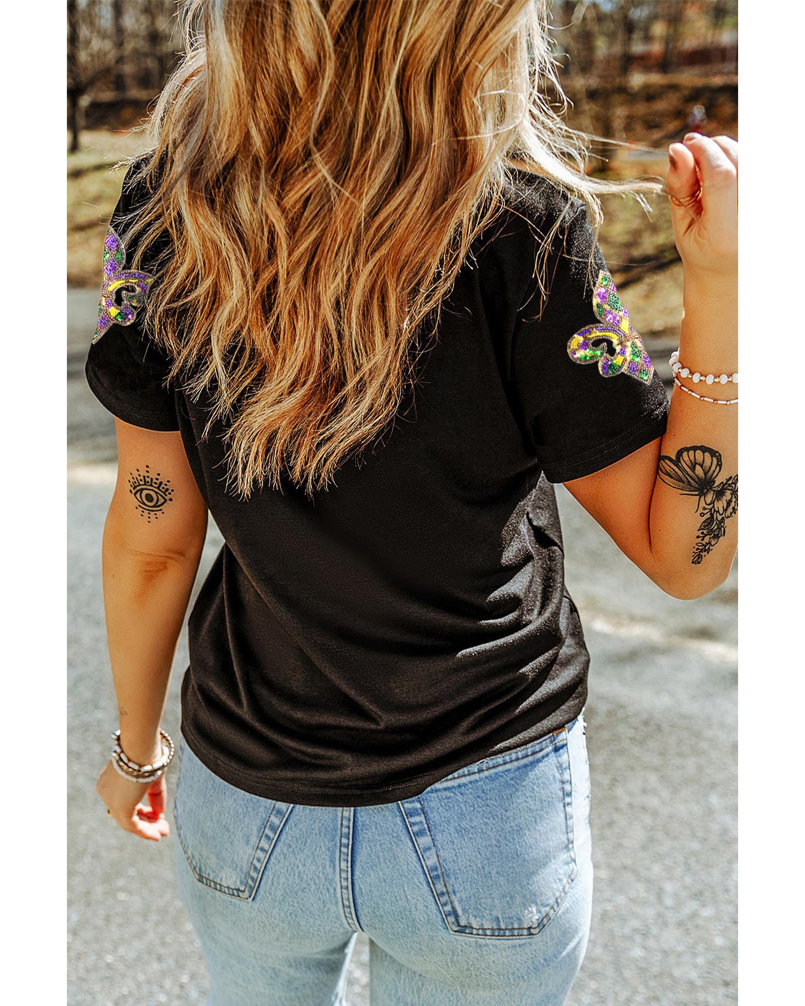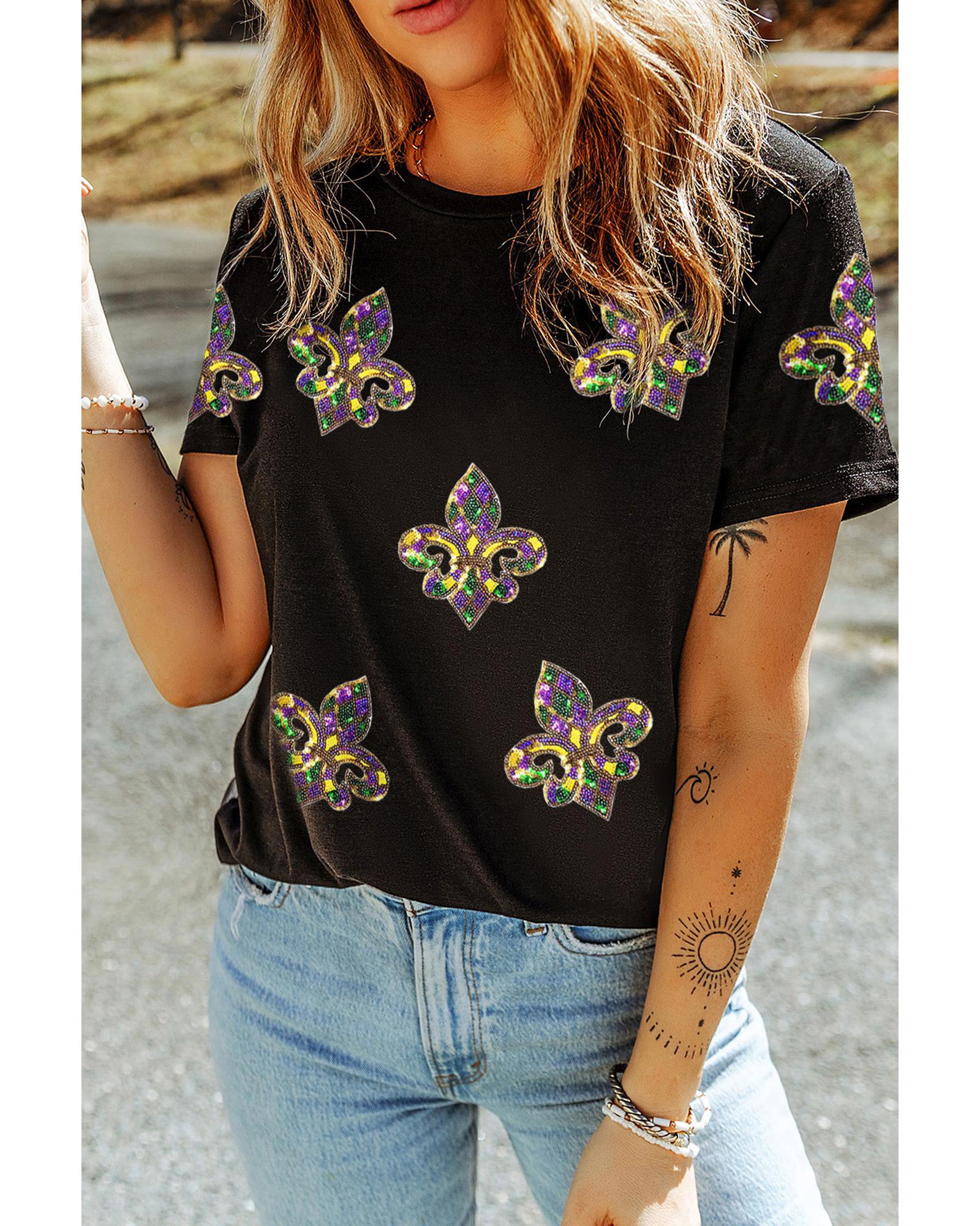 This graphic T-shirt features a sparkling sequin Fleur de Lis design, adding a vibrant and festive touch. It is crafted from soft, comfortable fabric, making it suitable for casual wear and celebrations. The shirt showcases lively Mardi Gras symbols, perfect for parade or party occasions.