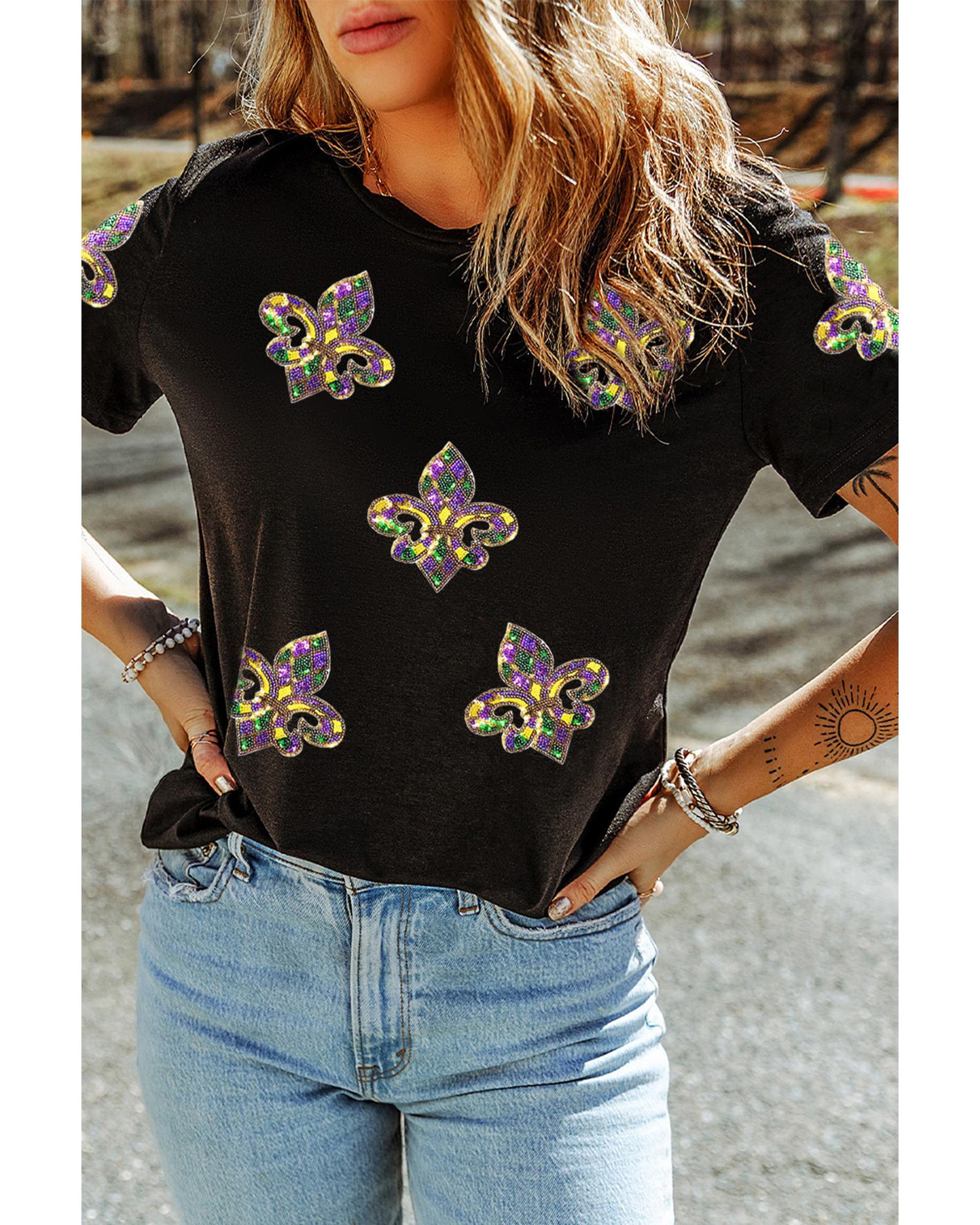 This graphic T-shirt features a sparkling sequin Fleur de Lis design, adding a vibrant and festive touch. It is crafted from soft, comfortable fabric, making it suitable for casual wear and celebrations. The shirt is designed with a trendy fitted look, following international sizing standards.