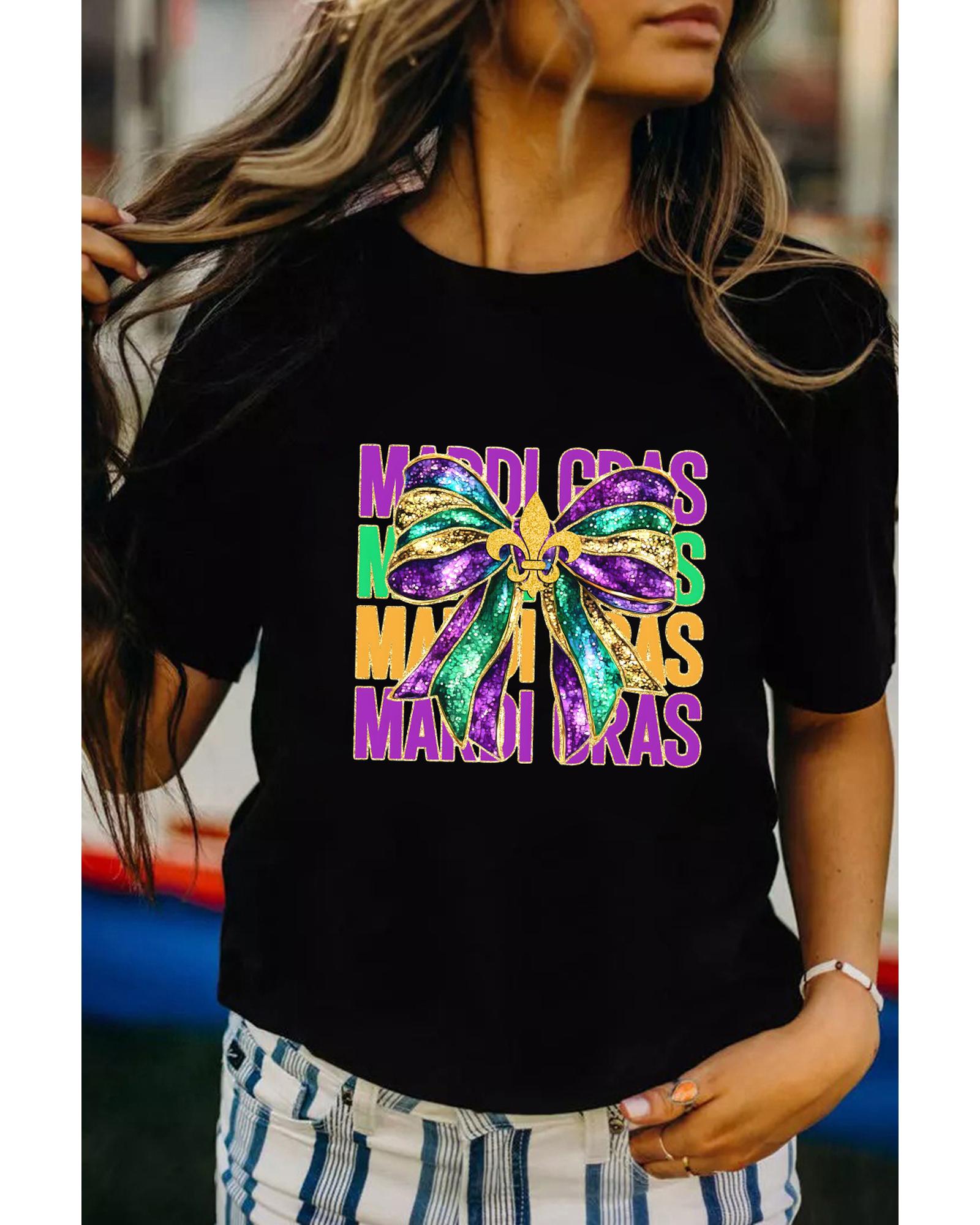 Black MARDI GRAS Fleur de Lis Bowknot Printed Crewneck Tee – S