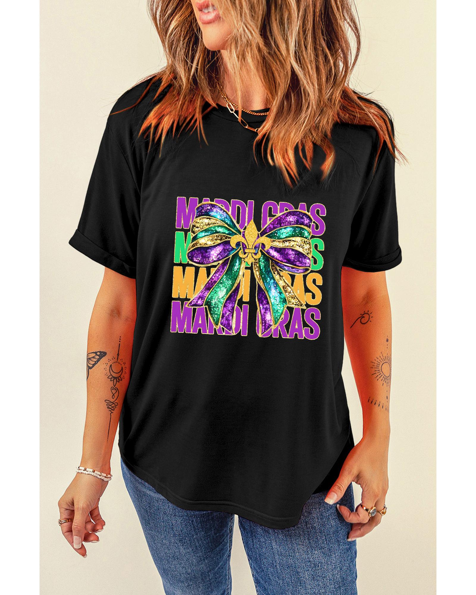 Black MARDI GRAS Fleur de Lis Bowknot Printed Crewneck Tee – XL