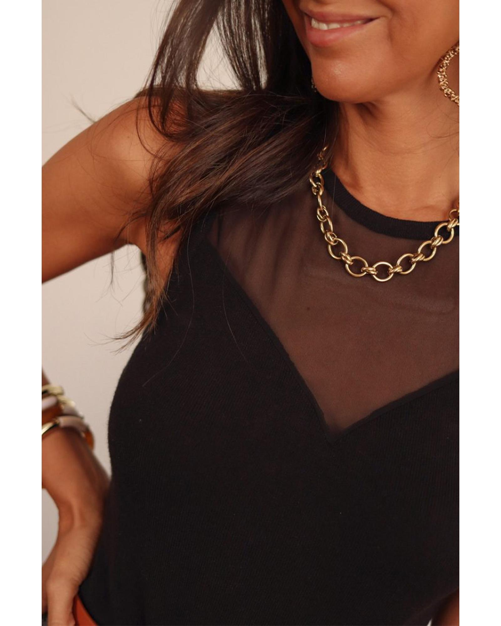 - Black mesh patchwork sleeveless bodysuit with a sheer design