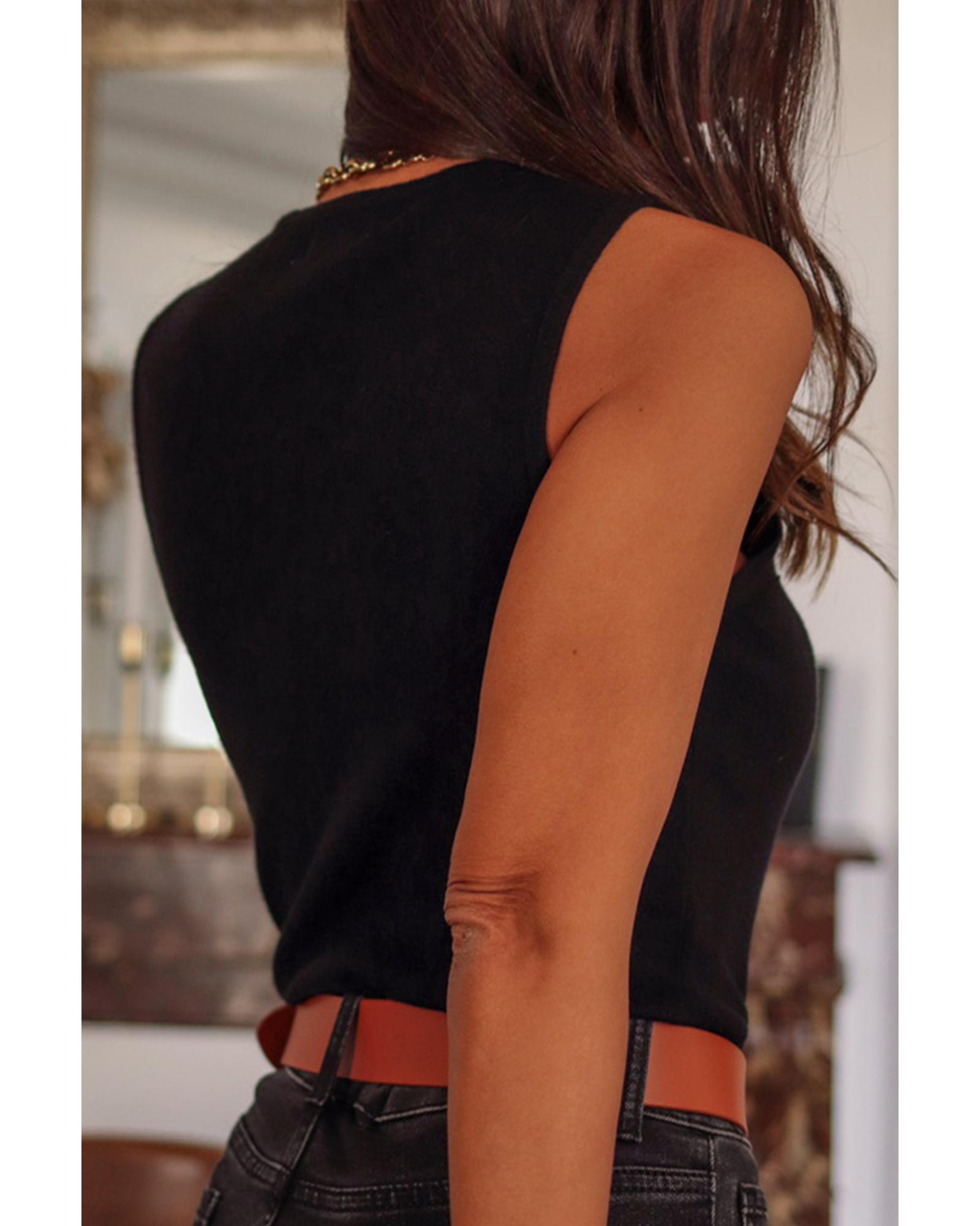 - Design includes a crew neck and sleeveless silhouette with a bodycon fit
