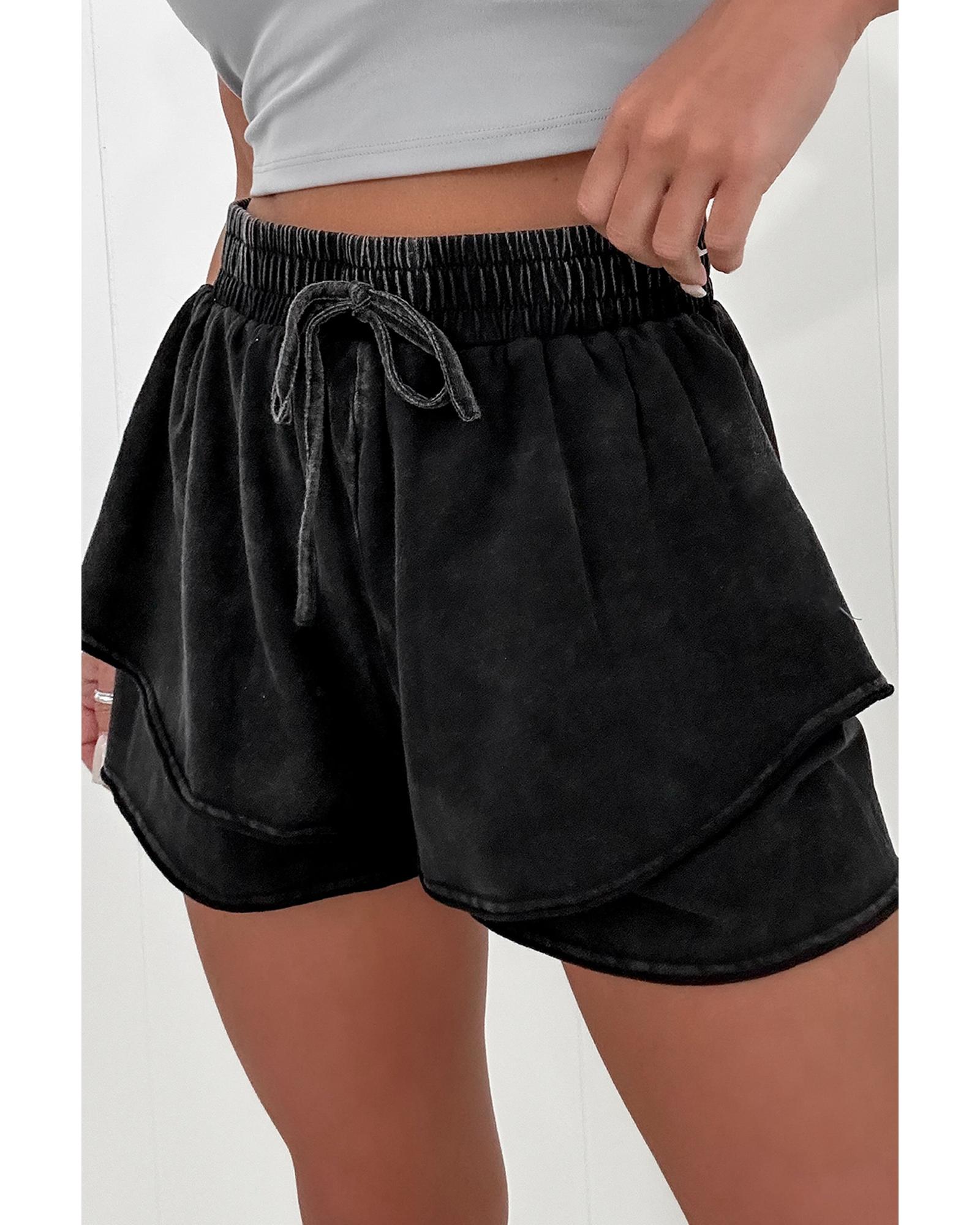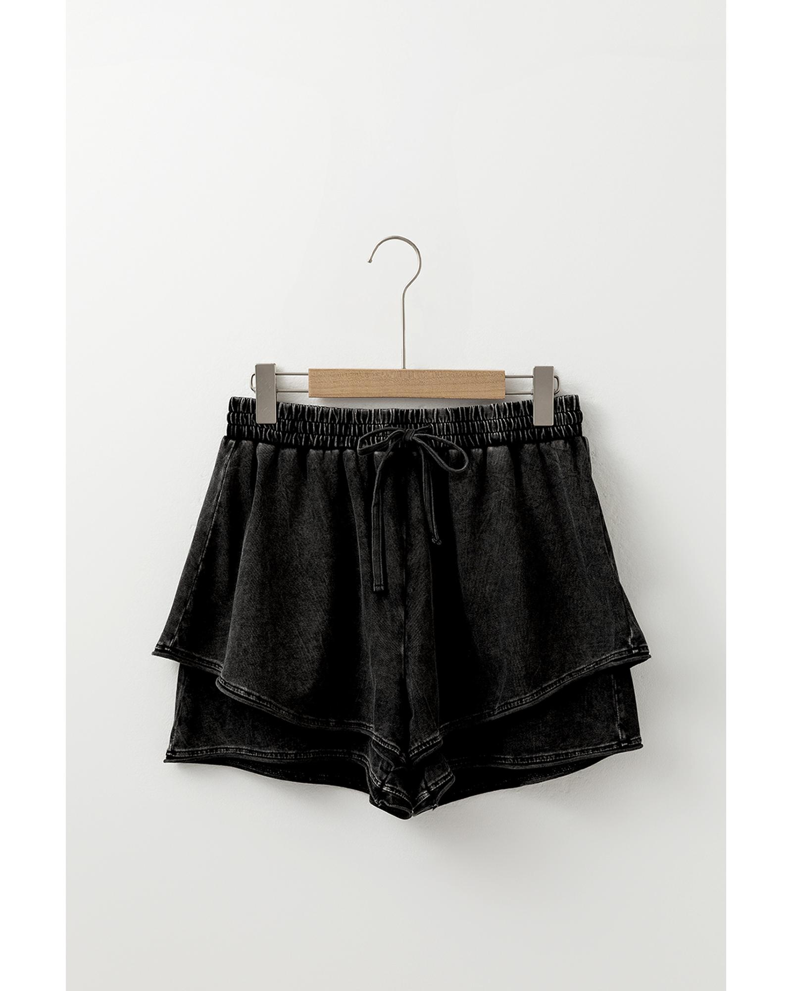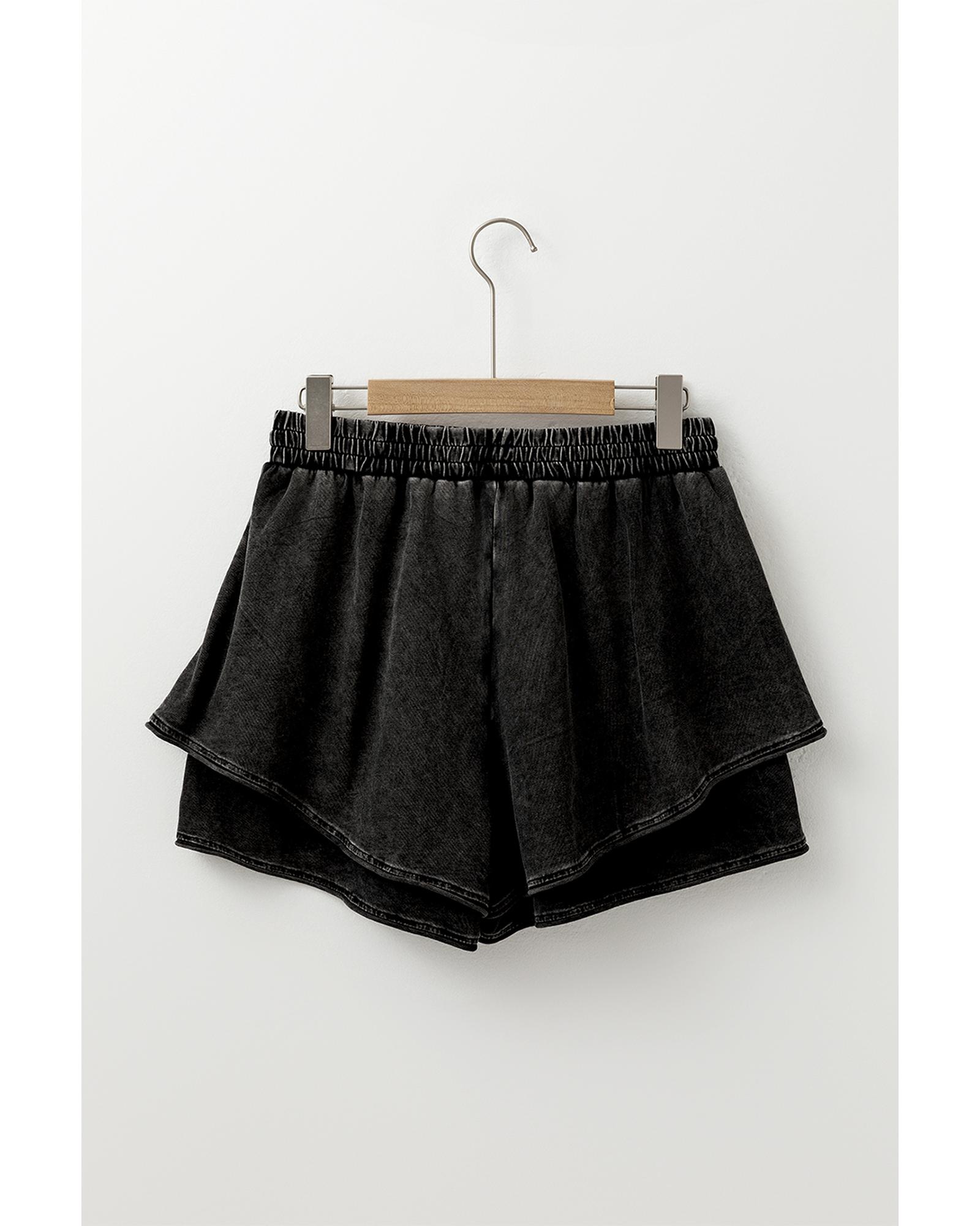 This pair of casual shorts features a stylish black mineral wash finish and a high-waisted design that offers a flattering fit. Crafted from soft French terry fabric, these shorts combine comfort with a unique tiered style, making them suitable for various casual occasions.