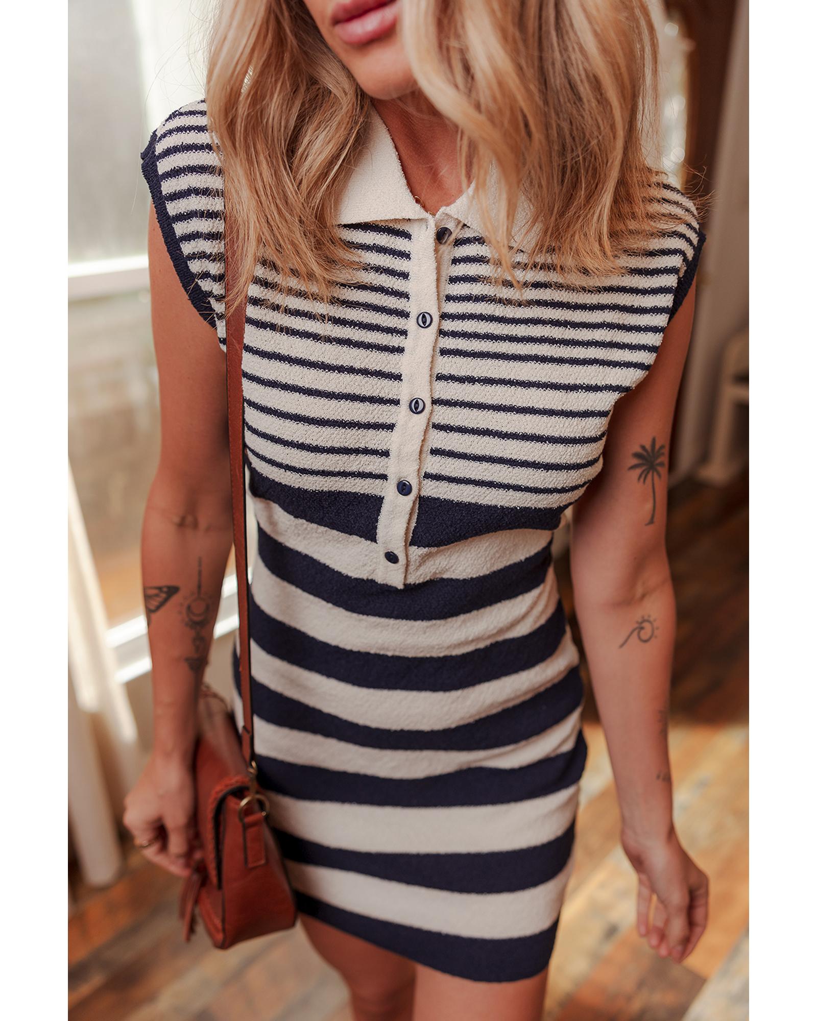 This sweater dress features a stylish mixed striped print with a unique half placket and collar design. It is crafted with cap sleeves and a flattering bodycon silhouette, making it suitable for various occasions. The dress offers high elasticity for comfort and is made from 100% polyester.