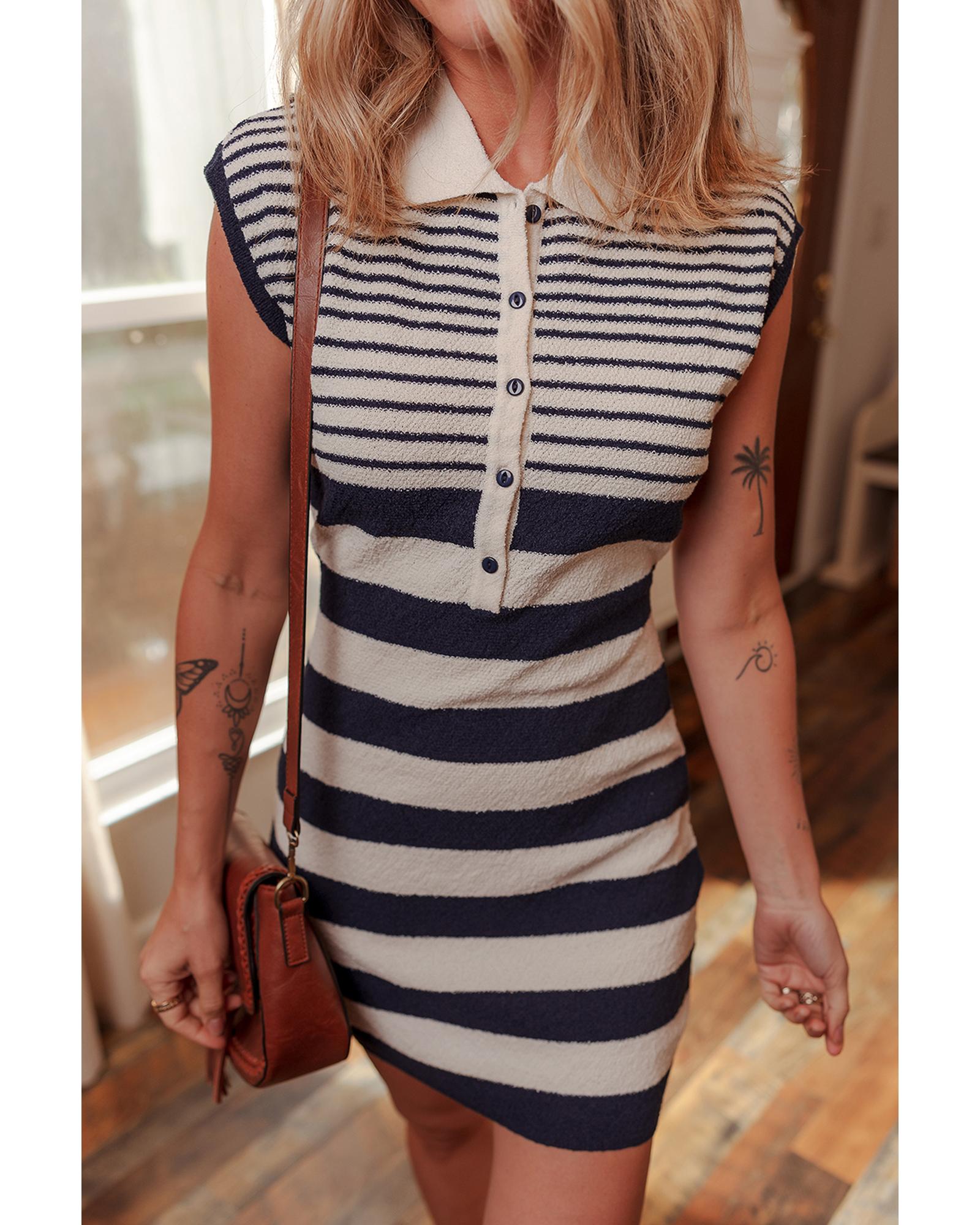 This sweater dress features a stylish mixed striped print with a unique half placket and collar design. It is designed with cap sleeves and a flattering bodycon silhouette, making it suitable for various occasions. The dress offers high elasticity for comfort and is made from 100% polyester.