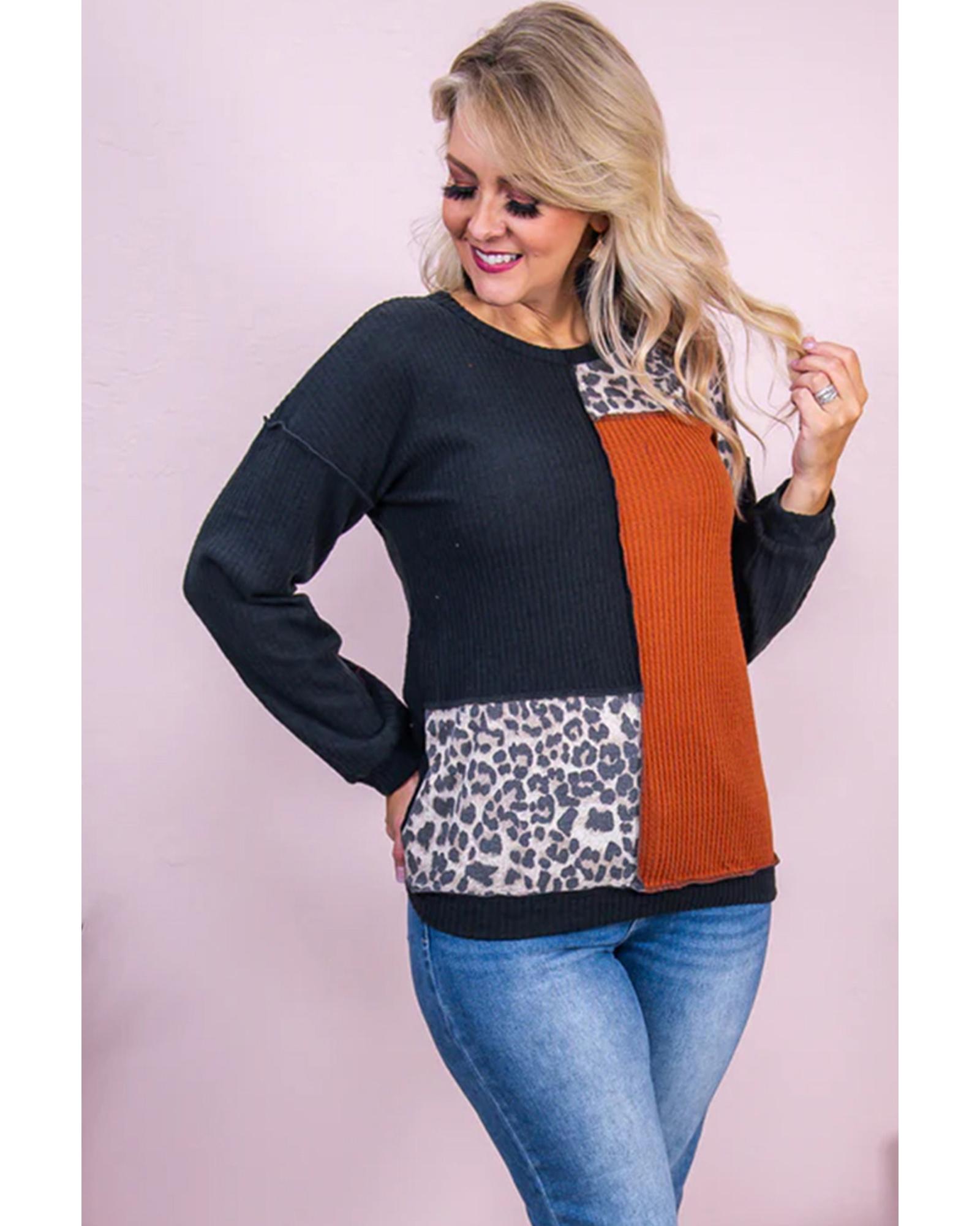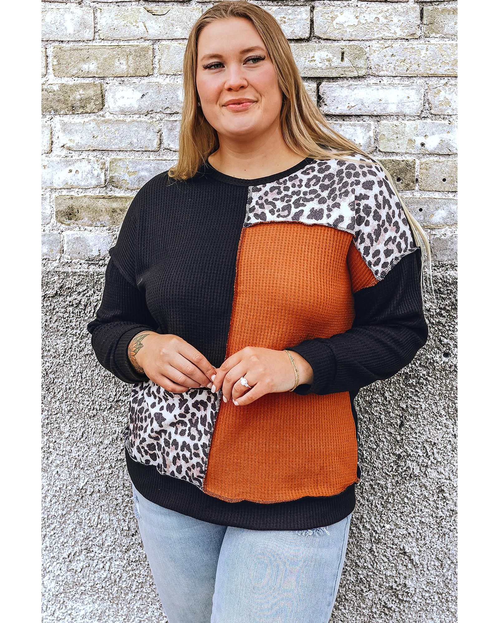 This stylish plus size top features a bold colorblock design with leopard patchwork, combining trendy fashion with comfort. Made from soft waffle knit fabric, it is suitable for daily wear and offers a cozy fit. The long sleeve design makes it perfect for cooler days, providing both style and warmth.