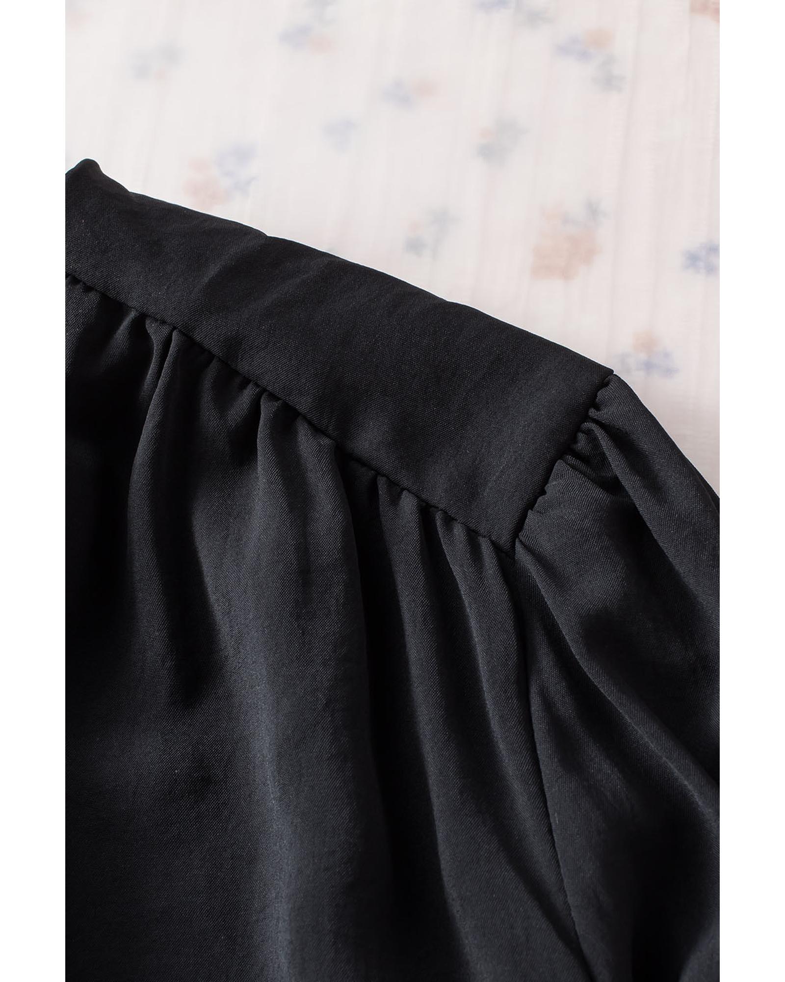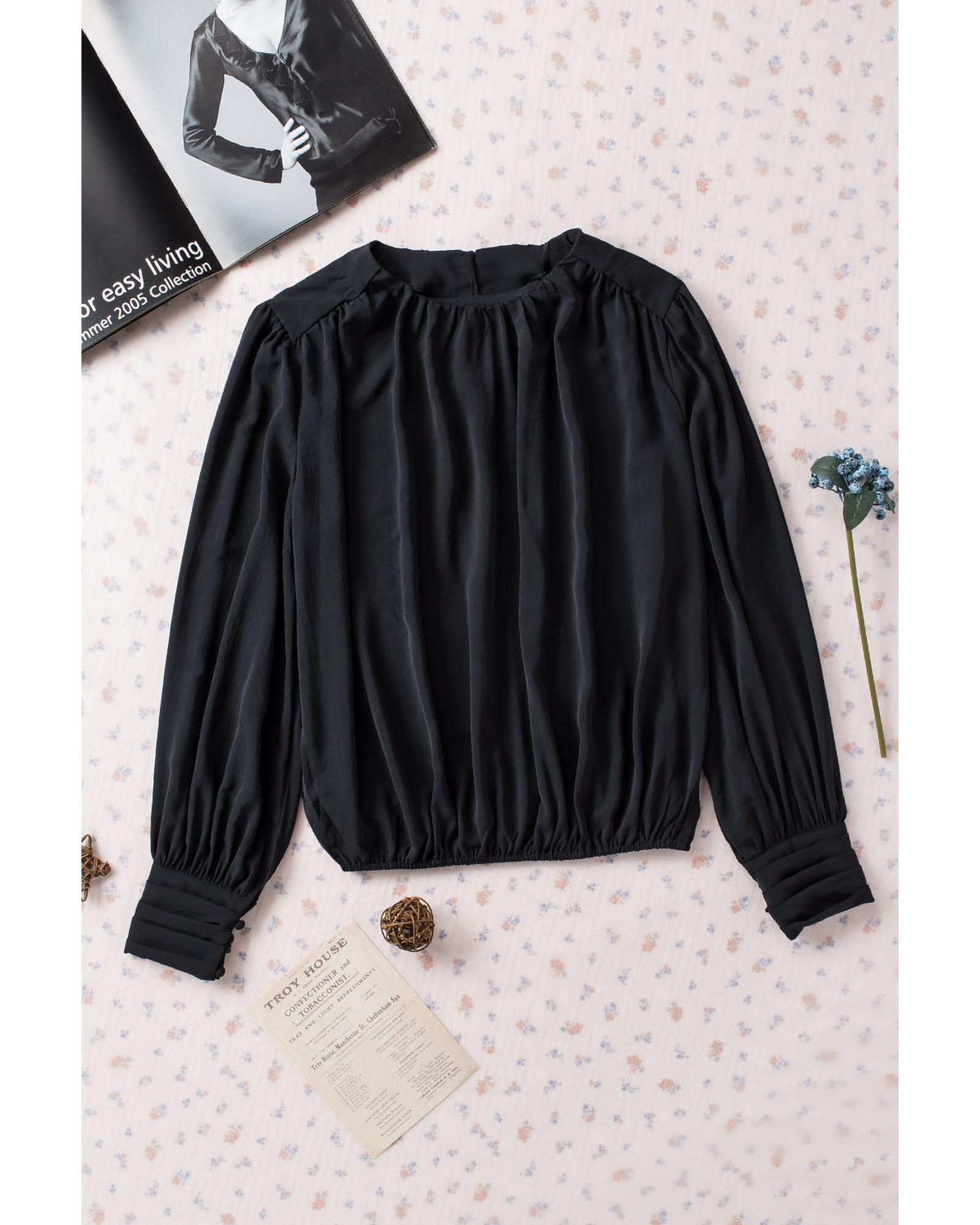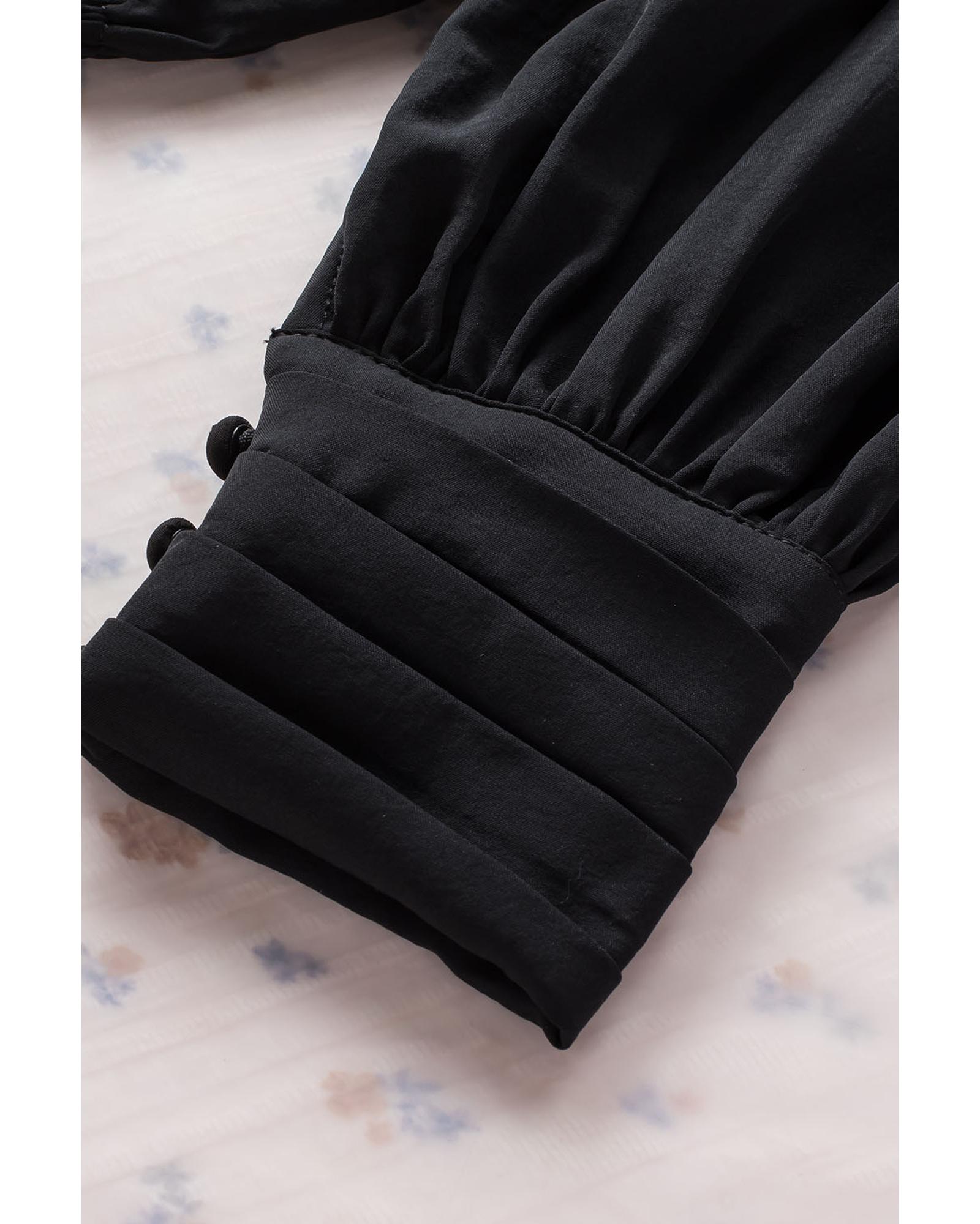 This black pleated blouse features a loose fit with padded shoulders and buttoned cuffs, offering a stylish and versatile look suitable for both casual and formal occasions. The design emphasizes comfort, femininity, and attention to detail, making it a fashionable addition to any wardrobe.