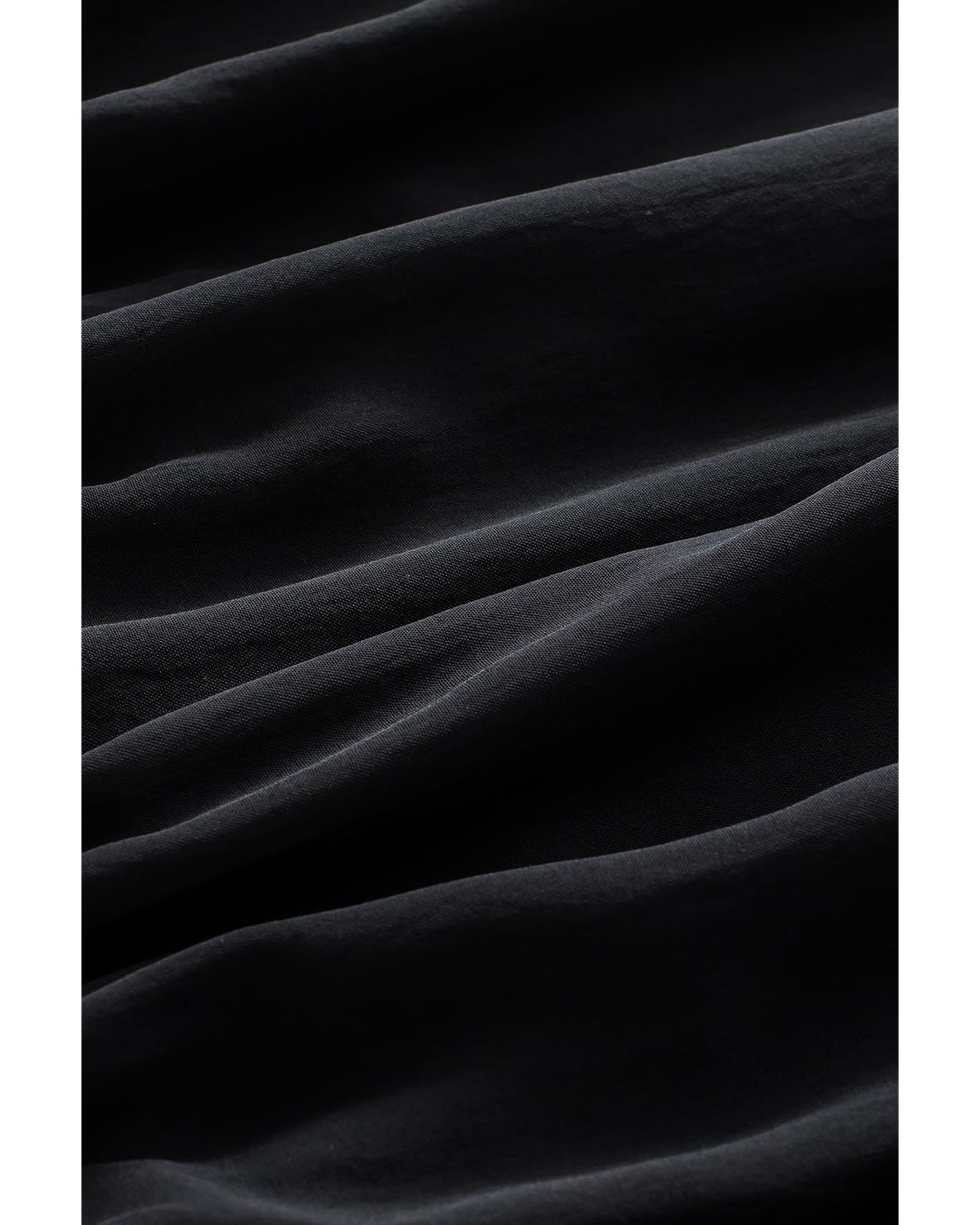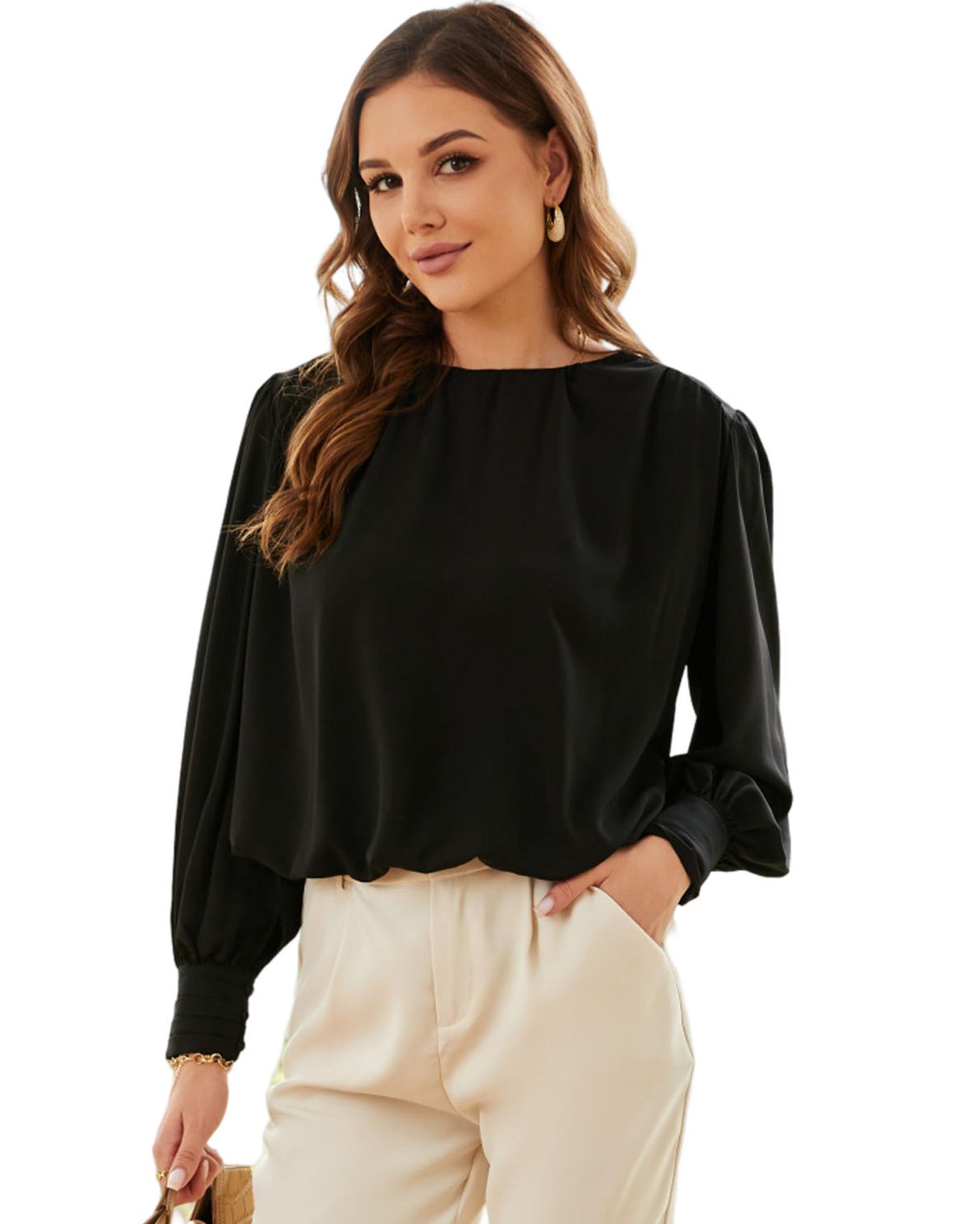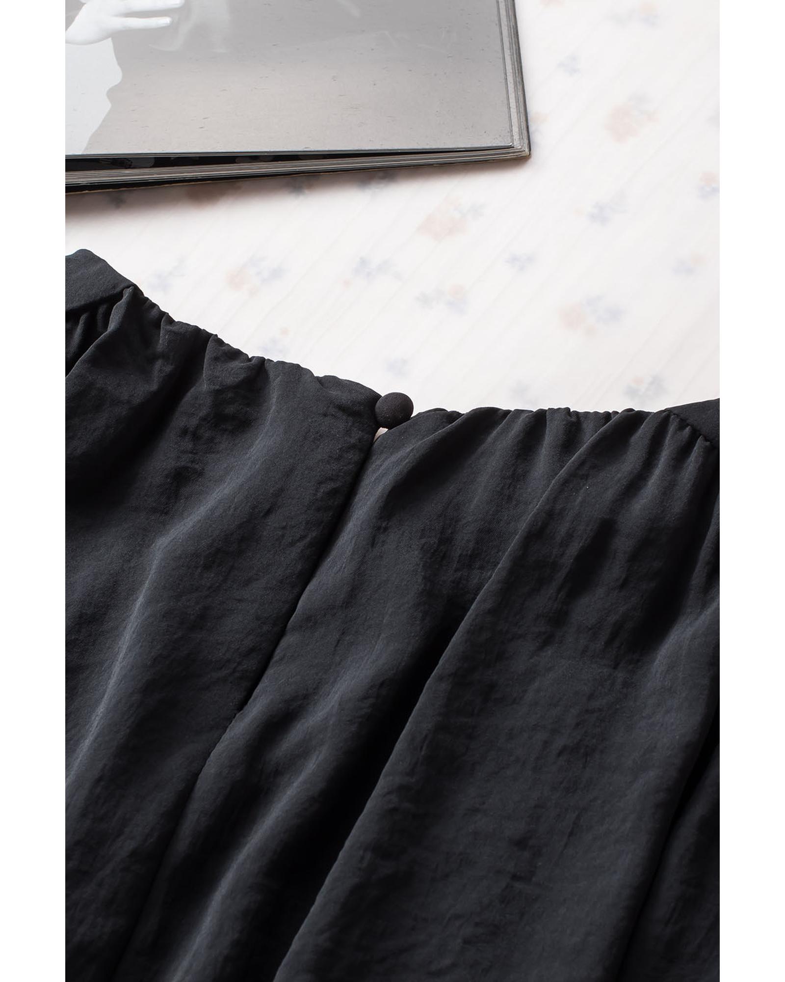 This black pleated blouse features a loose fit with padded shoulders and buttoned cuffs, offering a stylish and versatile look suitable for both casual and formal occasions. The design emphasizes comfort, femininity, and attention to detail, making it a fashionable addition to any wardrobe.