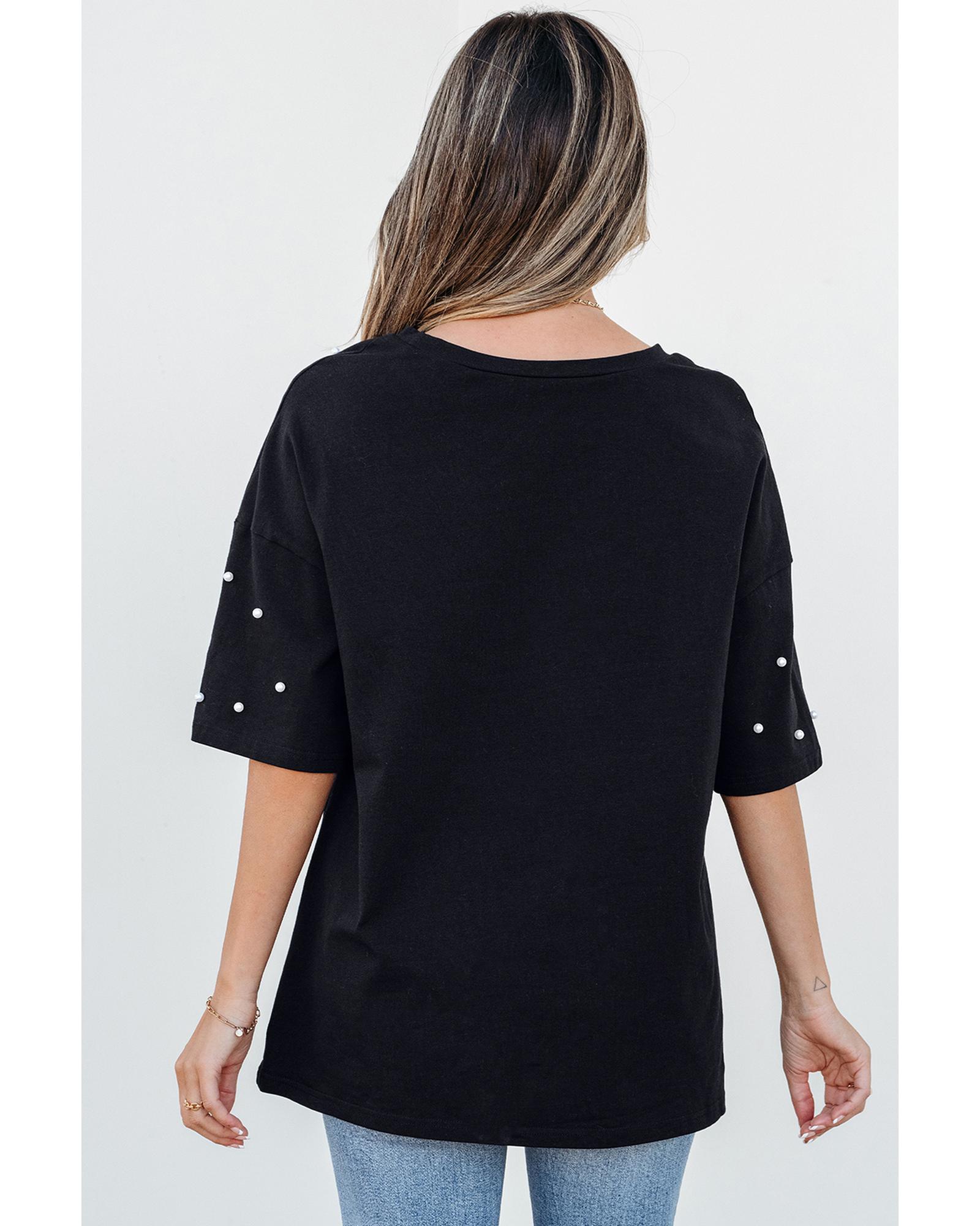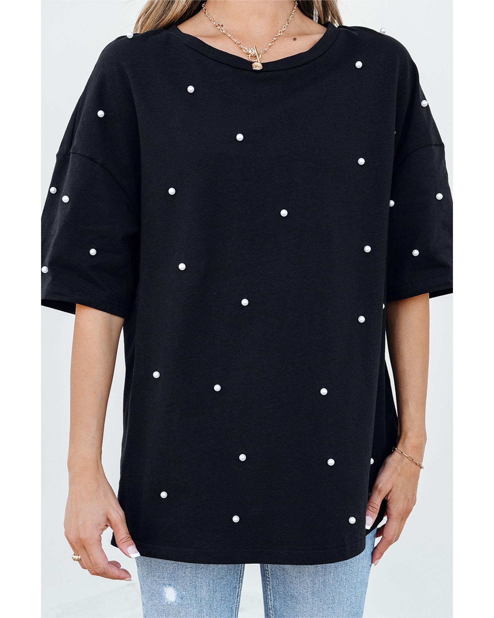 Package Content: 1 x Black Pearl Beaded Drop Shoulder Crewneck T-shirt