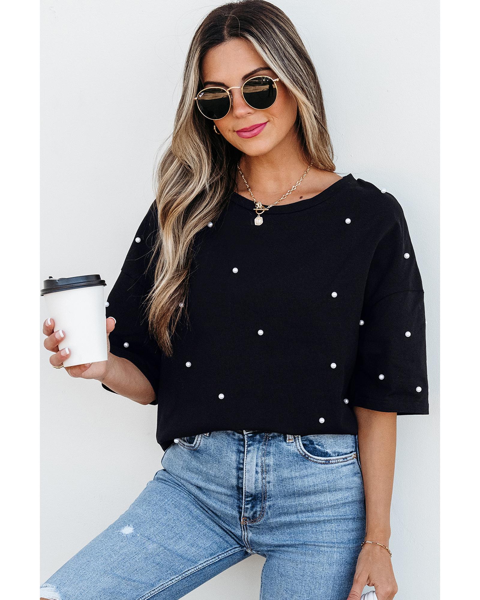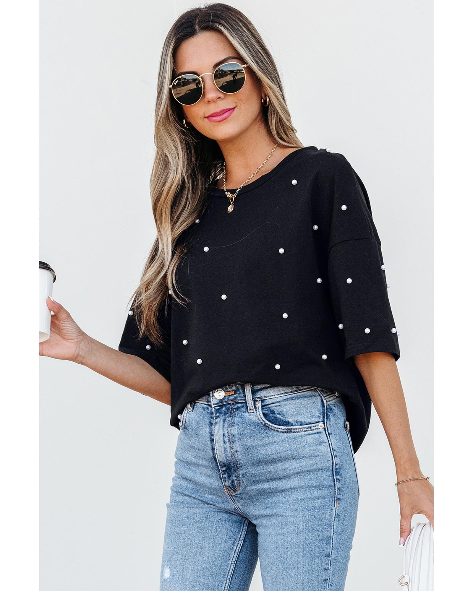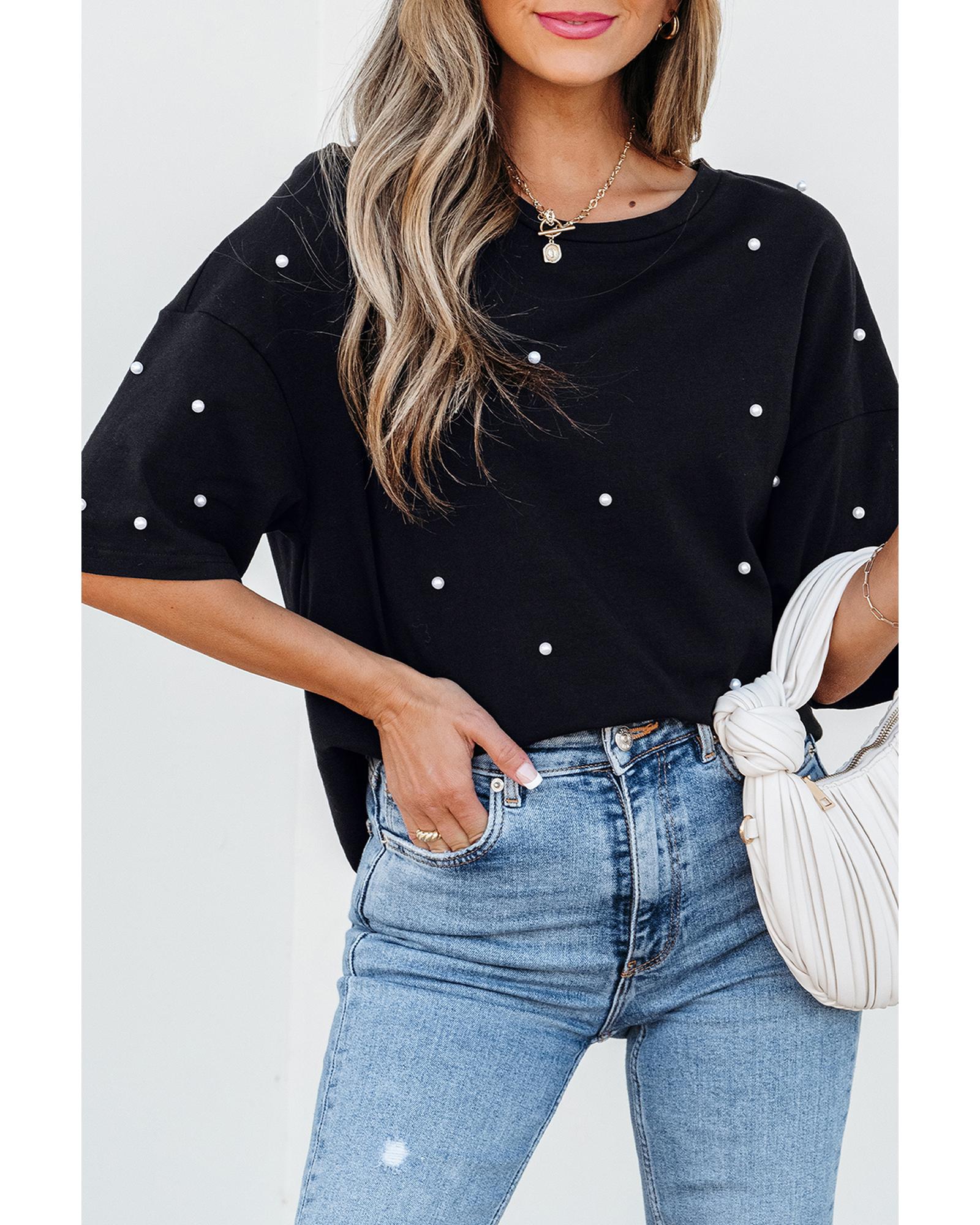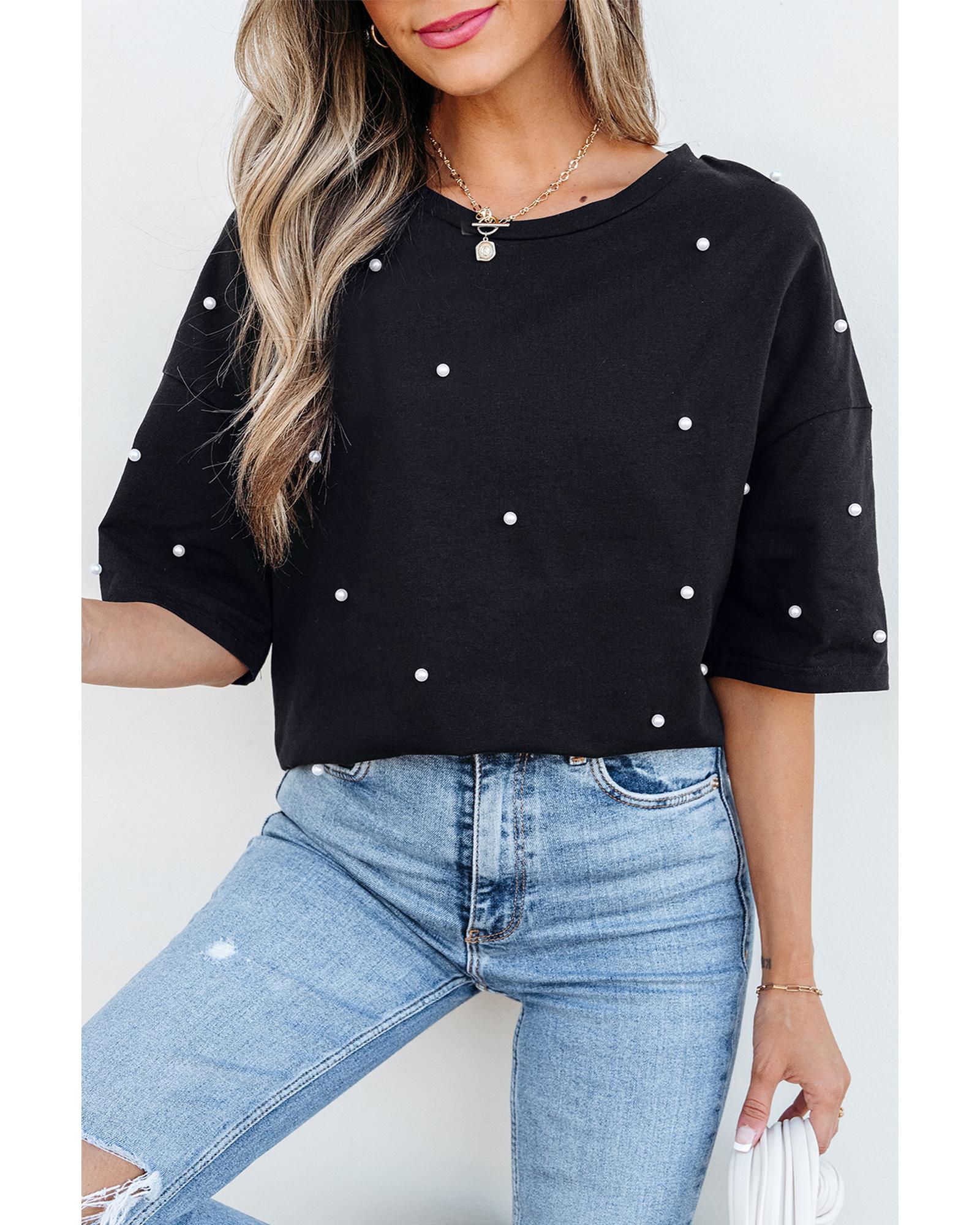 This black pearl beaded drop shoulder crewneck T-shirt combines delicate pearl embellishments with a relaxed fit, making it a versatile addition to any wardrobe. Its stylish design is suitable for casual outings or semi-formal occasions, offering both comfort and elegance.