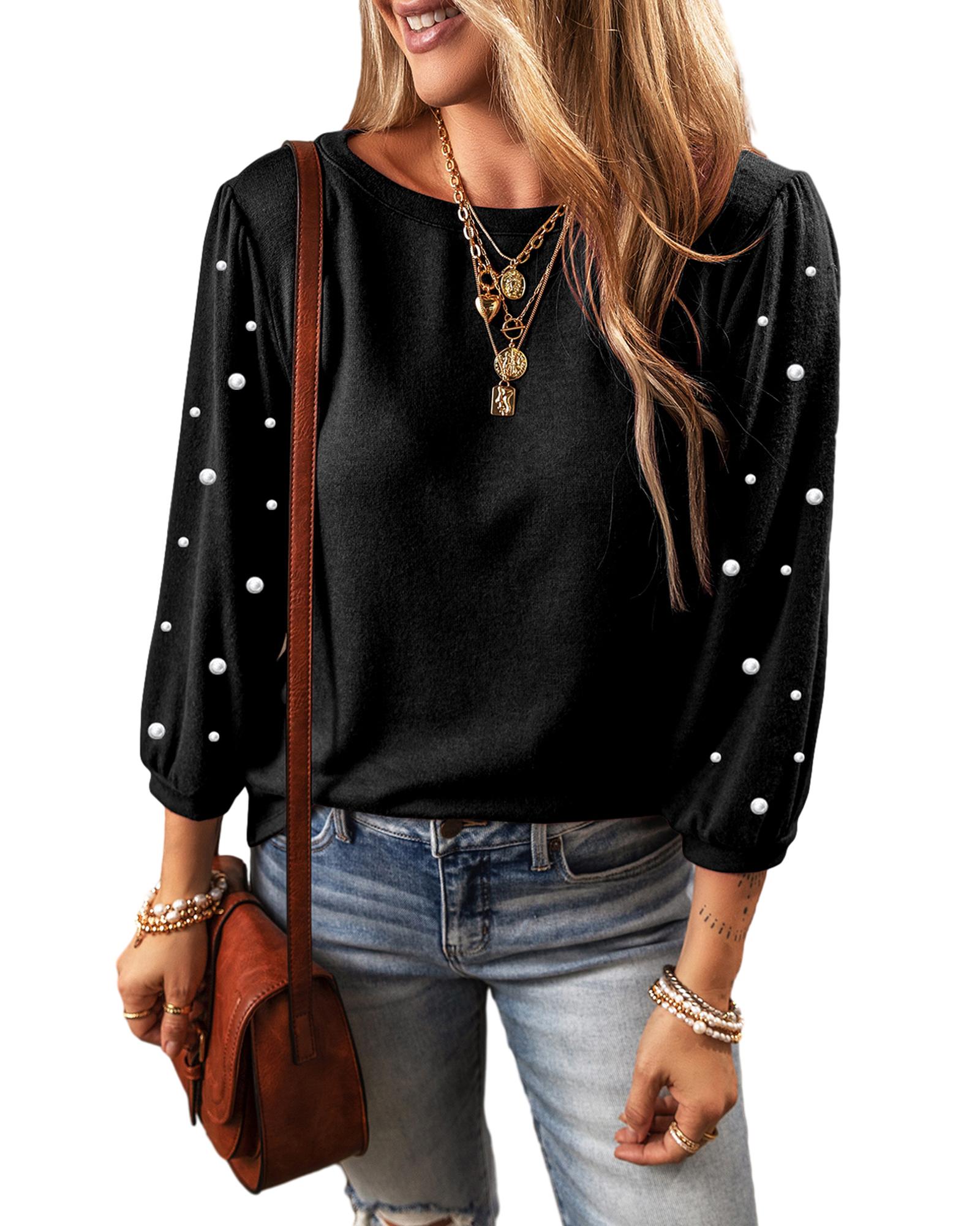 This black pearl decor T-shirt features a trendy fitted design with a comfortable crew neck and 3/4 sleeves. Its relaxed fit and high elasticity ensure a comfortable and flattering wear for various occasions. The subtle pearl embellishment adds an elegant touch, making it easy to pair with different bottoms for a stylish look.