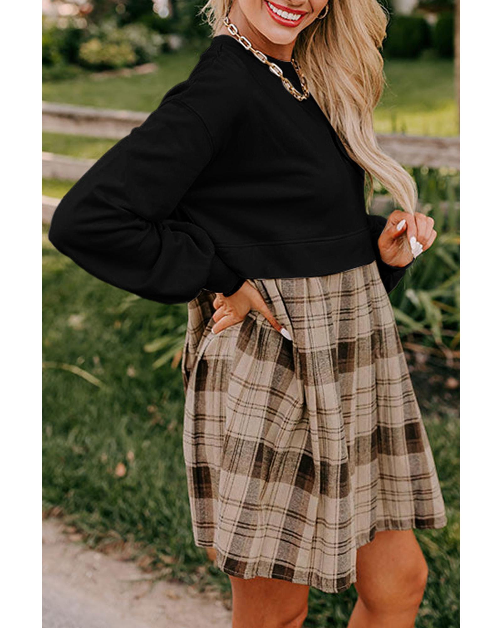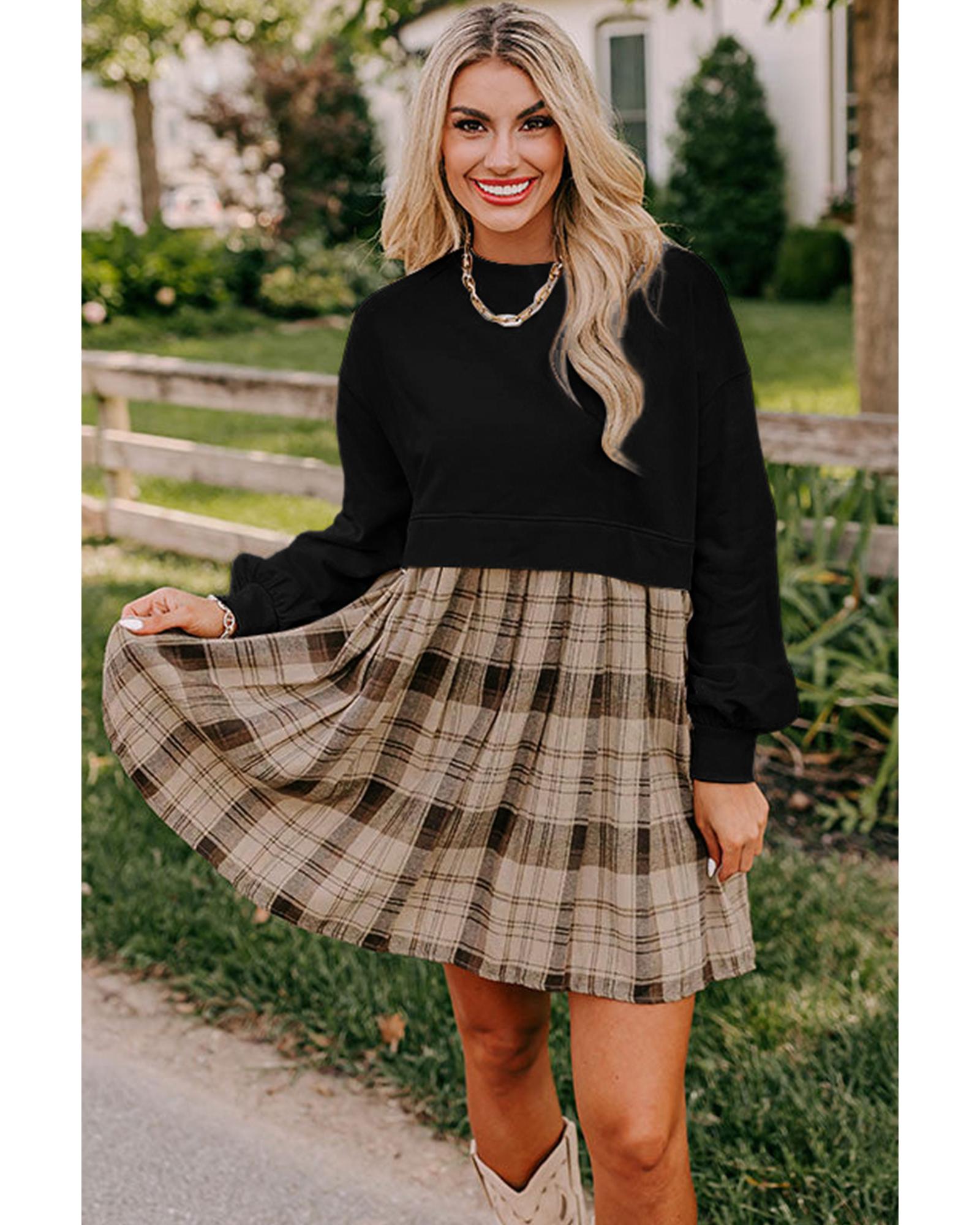 - 1 x Black plaid patchwork high waist sweatshirt mini dress