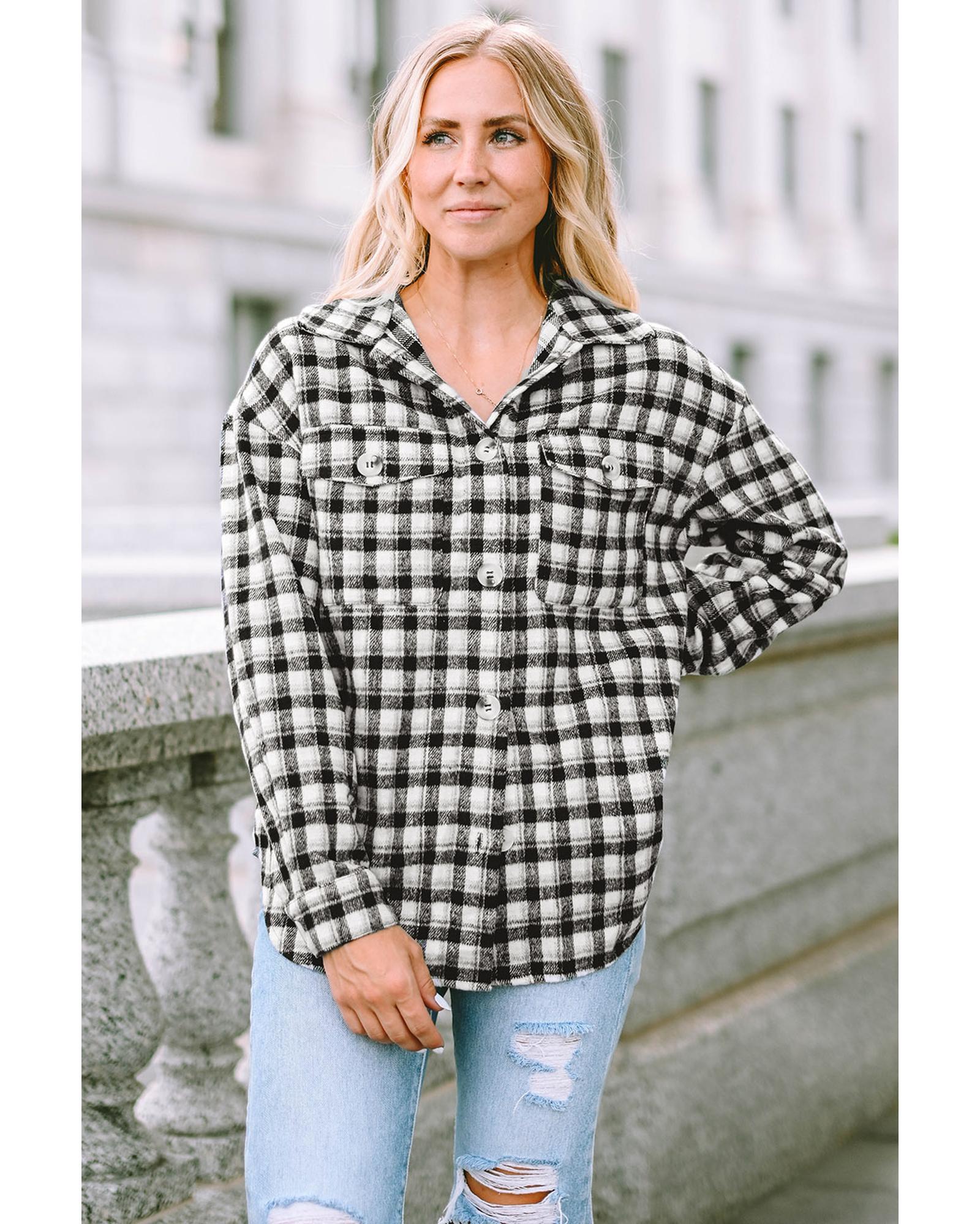 This black plaid print chest pockets buttoned shacket offers a trendy and versatile style suitable for various casual occasions. Its classic plaid pattern and functional design make it a timeless addition to your wardrobe.
