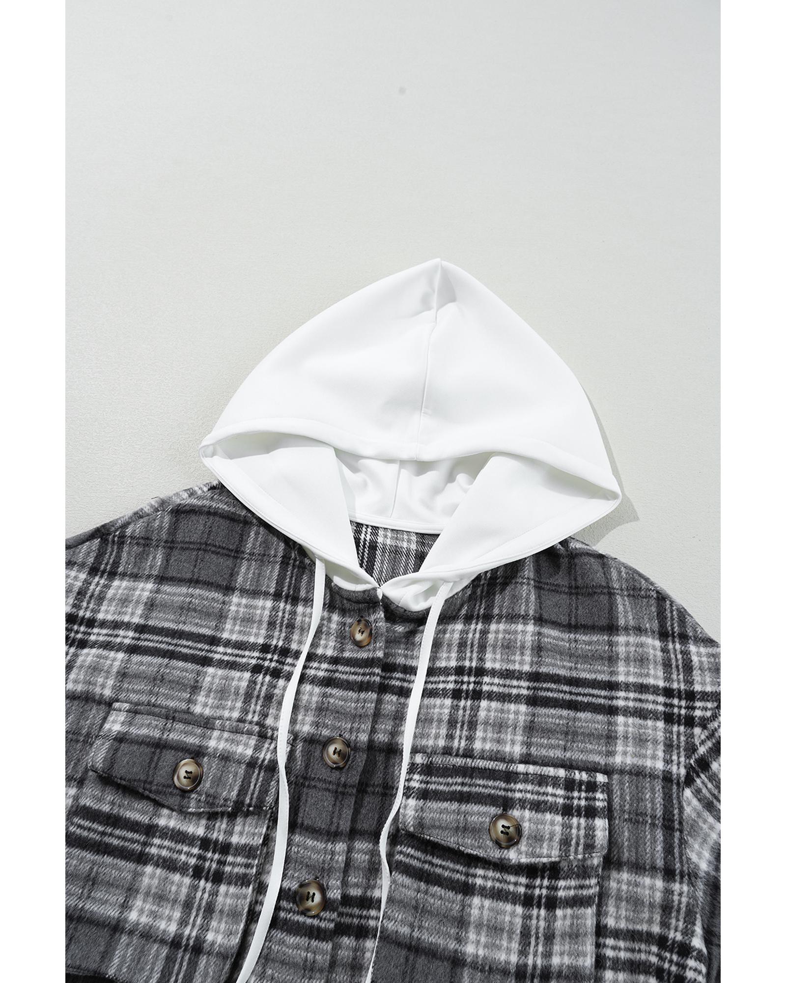 This black plaid print shacket combines a trendy design with practical features, making it a versatile addition to your wardrobe. Its loose fit ensures comfort, while the contrast hood adds a modern touch. The flap pockets provide convenience for everyday wear, making it suitable for layering across multiple seasons.