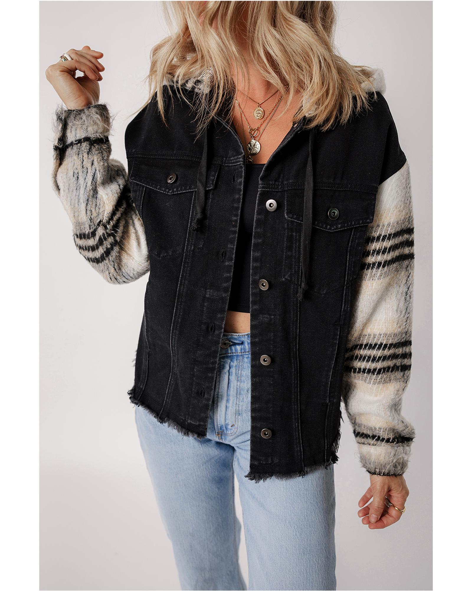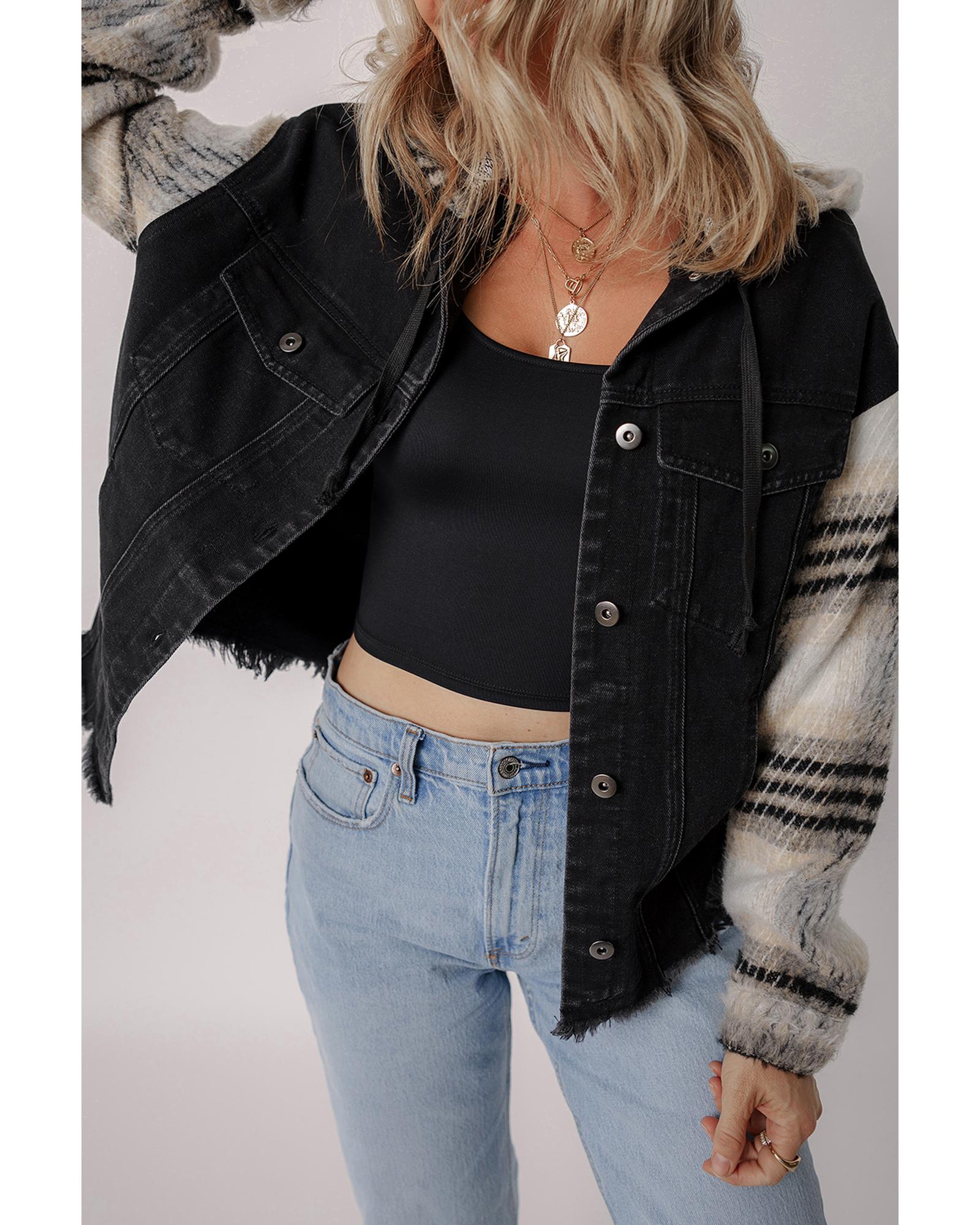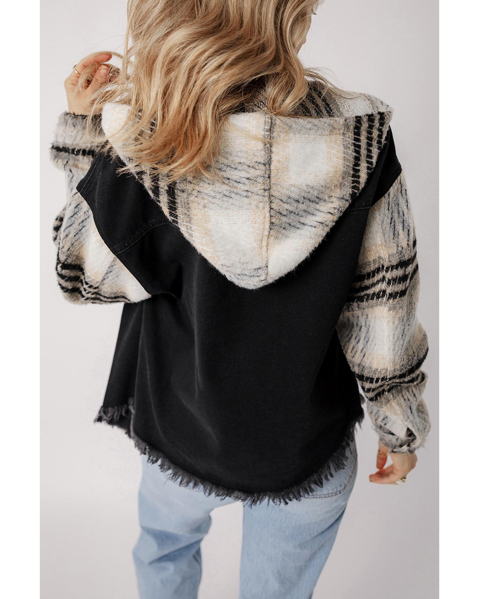 This black plaid sleeve hooded denim jacket features a trendy fitted design with stylish plaid sleeves and a raw frayed hem, offering a versatile and fashionable look suitable for various occasions. Made from durable denim material, it combines classic style with modern details for a standout appearance.