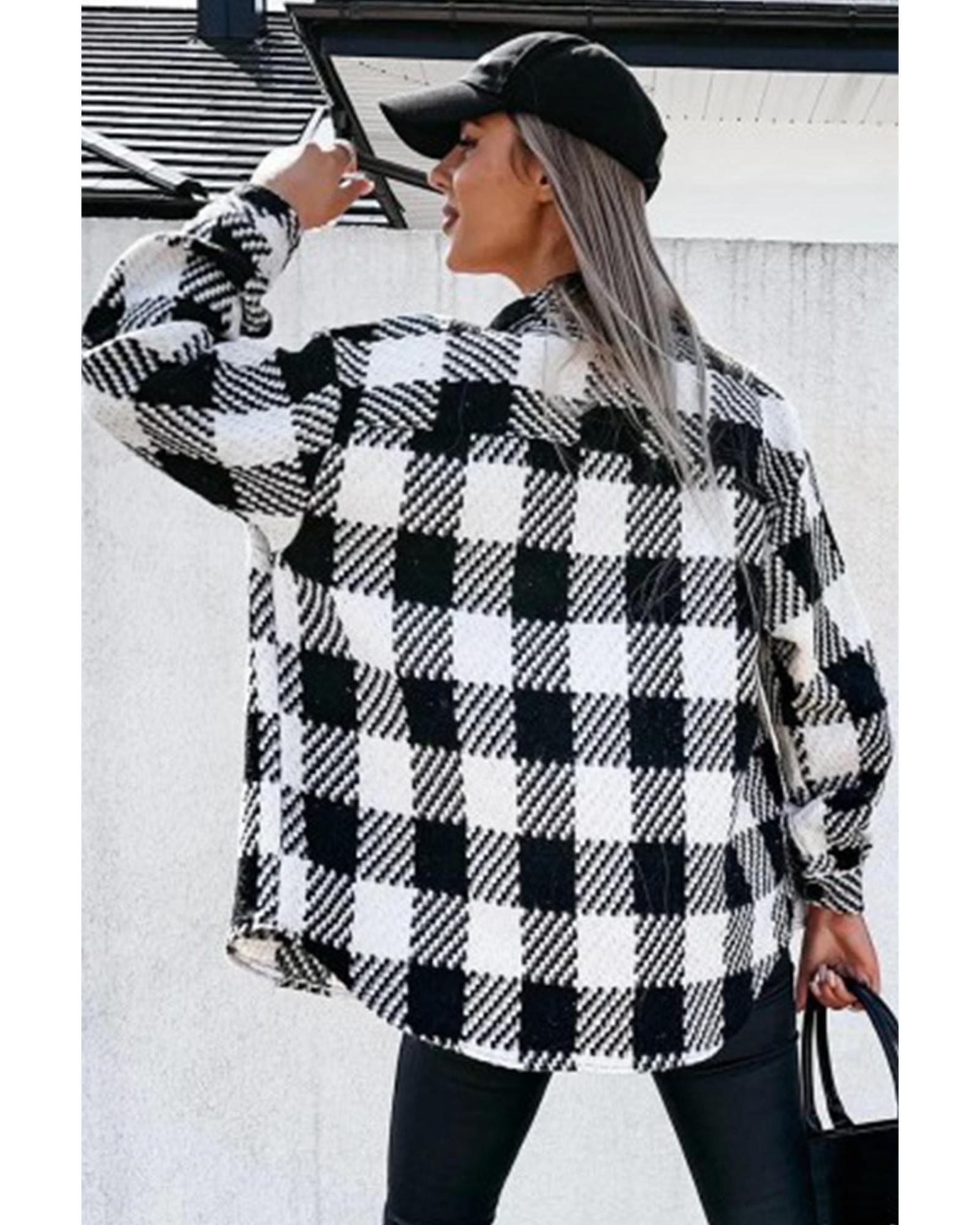 This black plaid textured shacket features a stylish and versatile design suitable for various occasions. It combines a trendy fitted look with practical details, making it a great addition to your wardrobe.