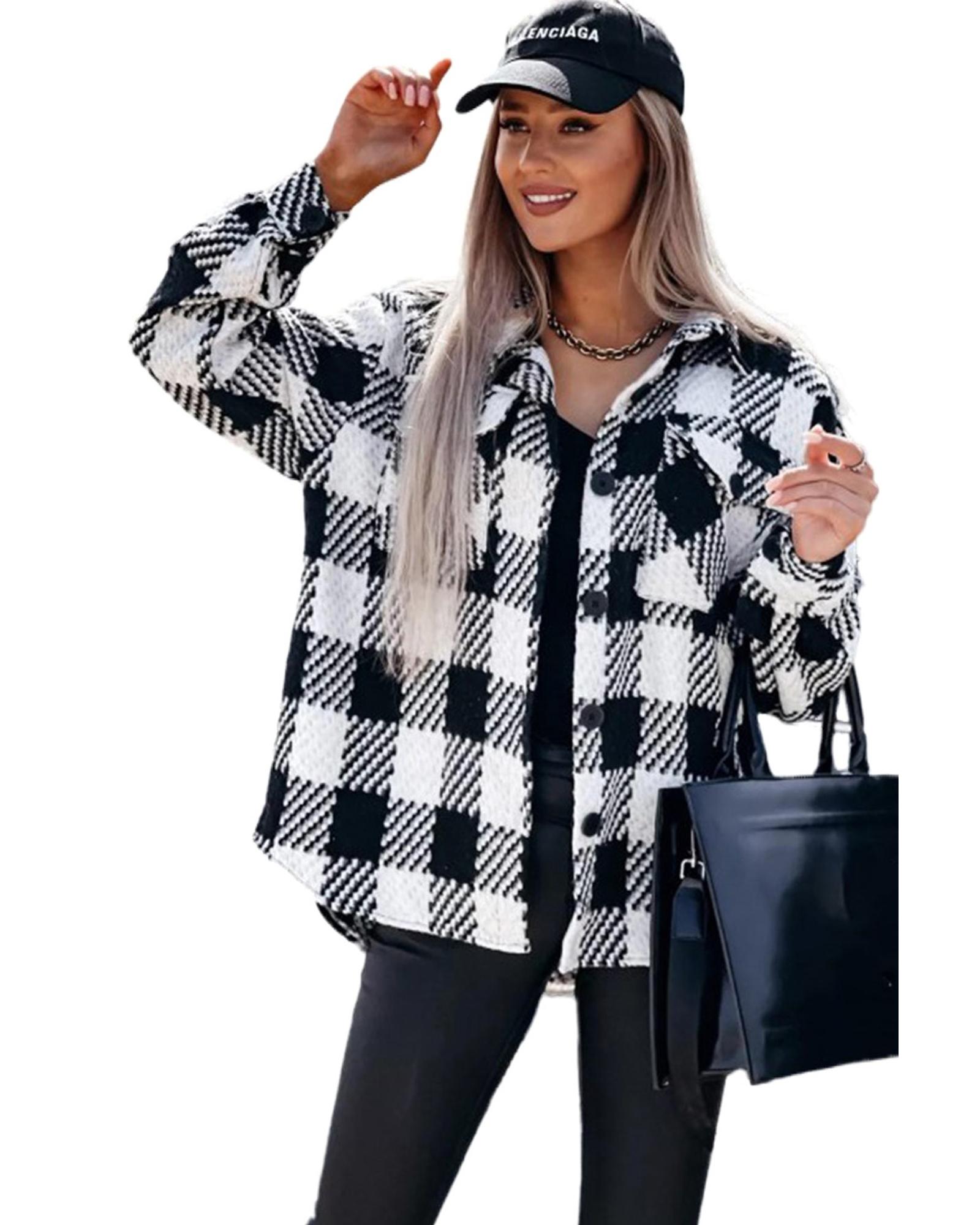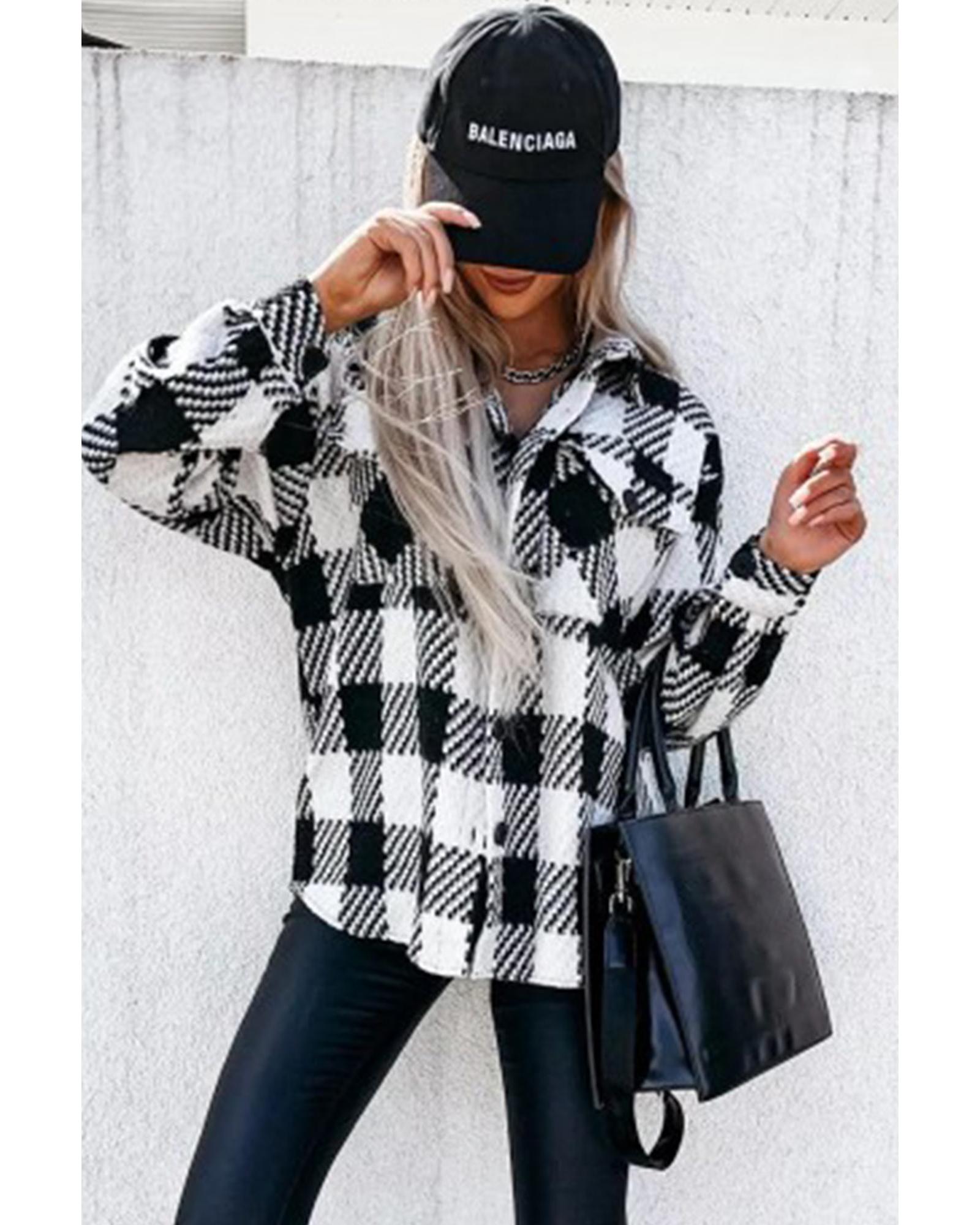 This black plaid textured shacket features a stylish design with a flap pocket on the front, making it a versatile addition to your wardrobe. Crafted from high-quality materials, it offers durability and a comfortable fit suitable for various occasions.
