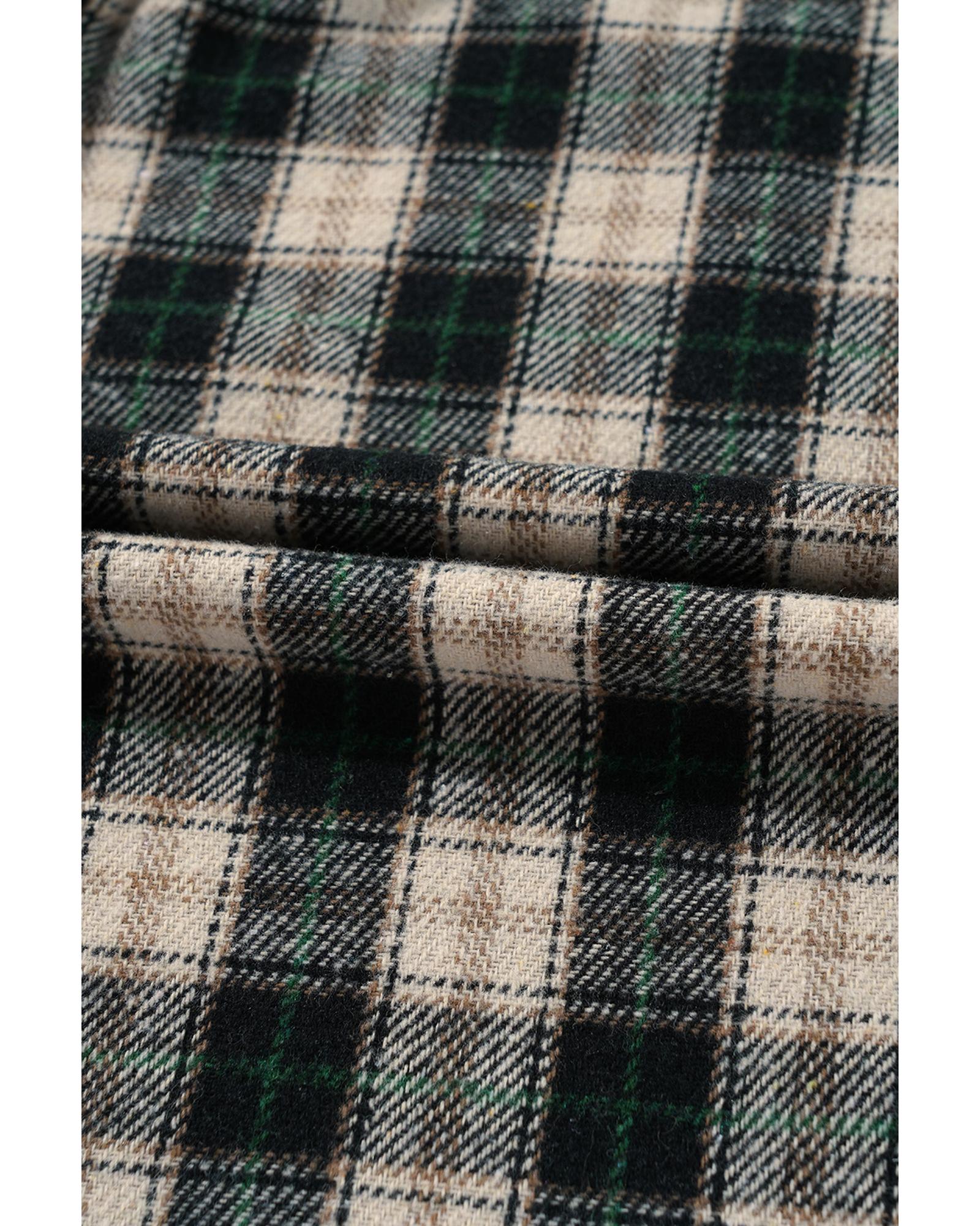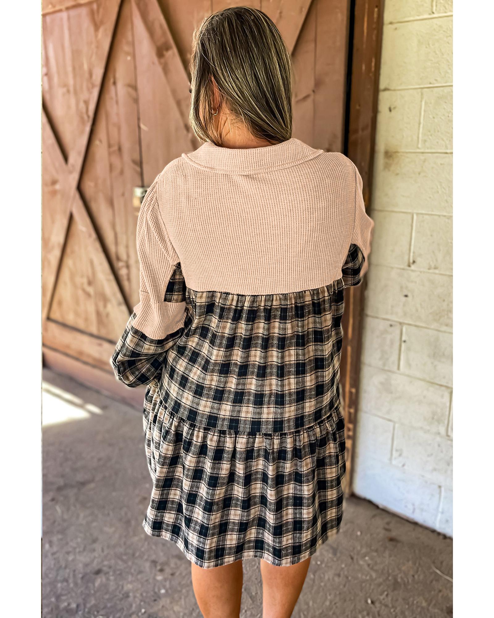 Black Plaid Waffle Knit Patchwork Collared V Neck Plus Size Mini Dress – 1X