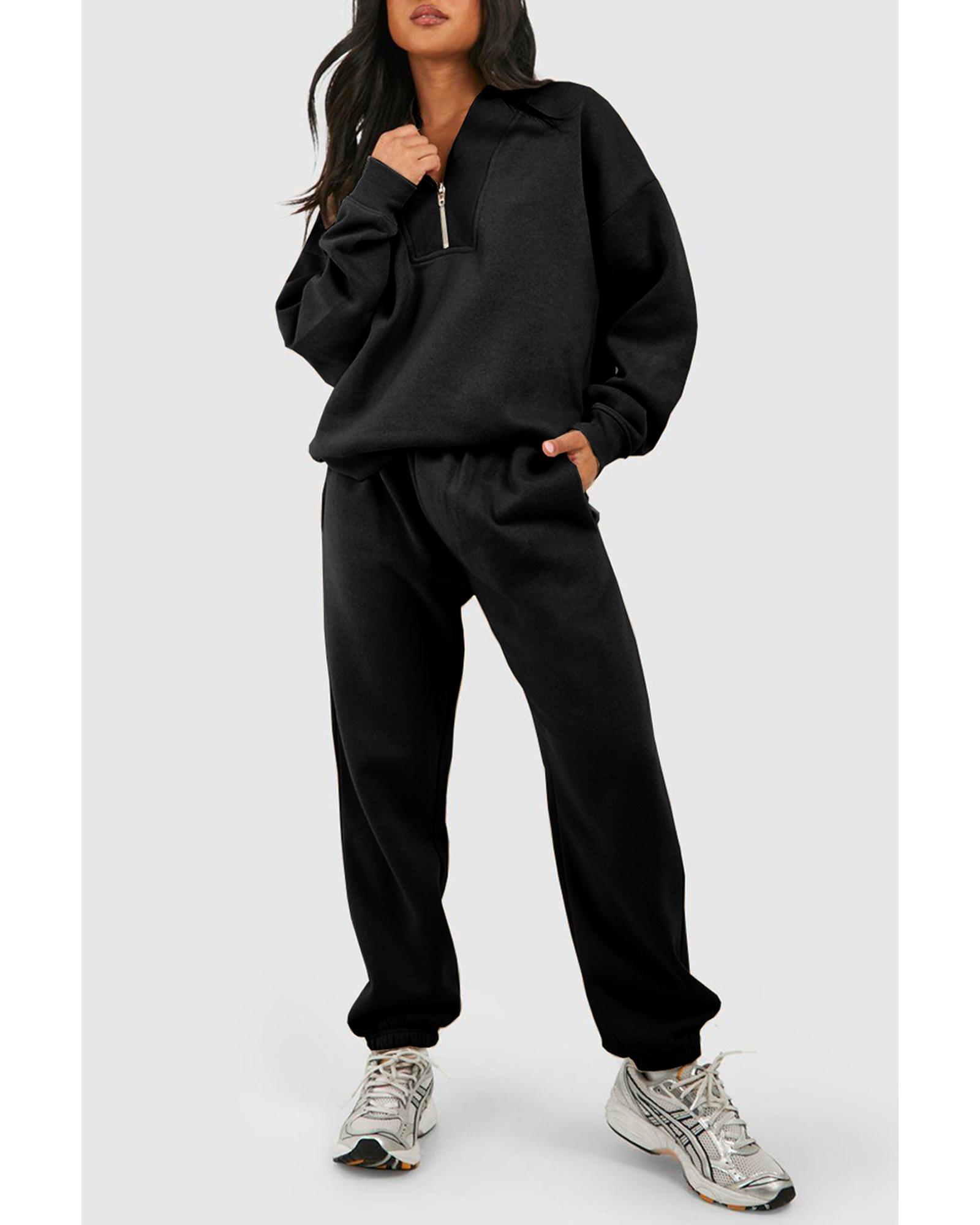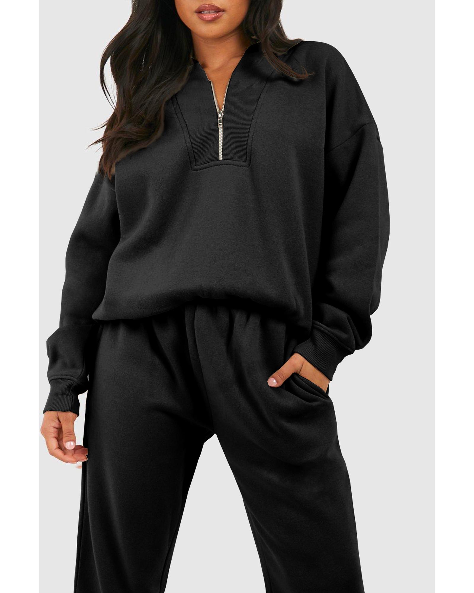 Black Plain Half Zip V Neck Ribbed Edge Loose Tracksuit – 2XL