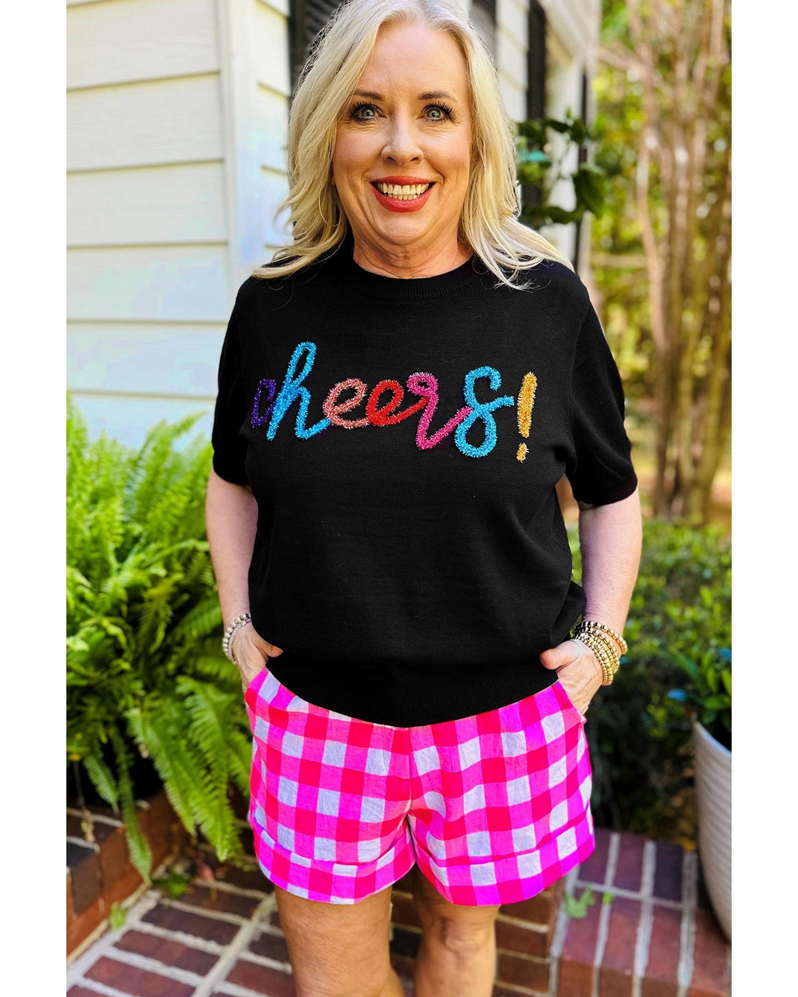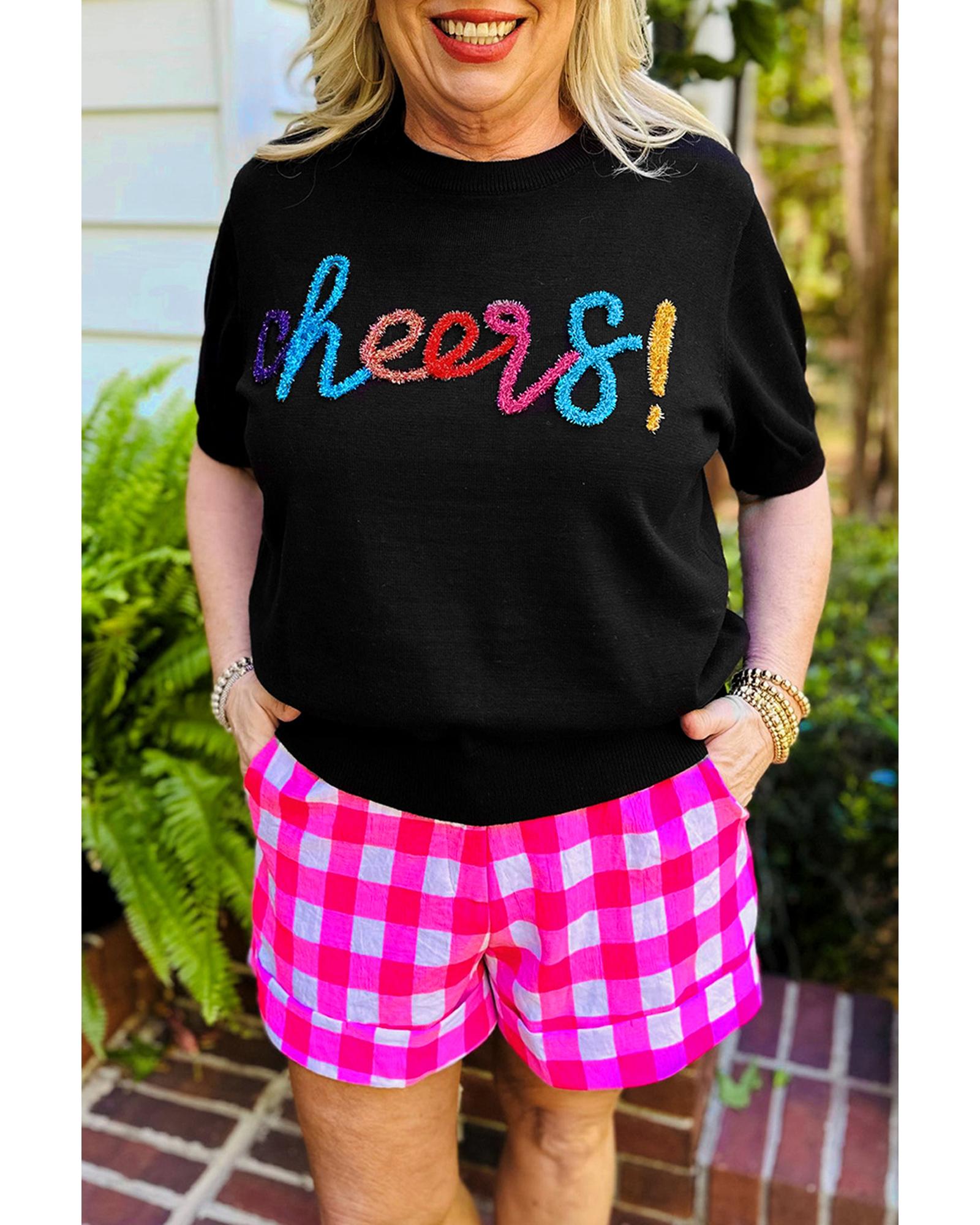 Black Plus Size Cheers Glitter Tinsel Short Sleeve Sweater – 2X