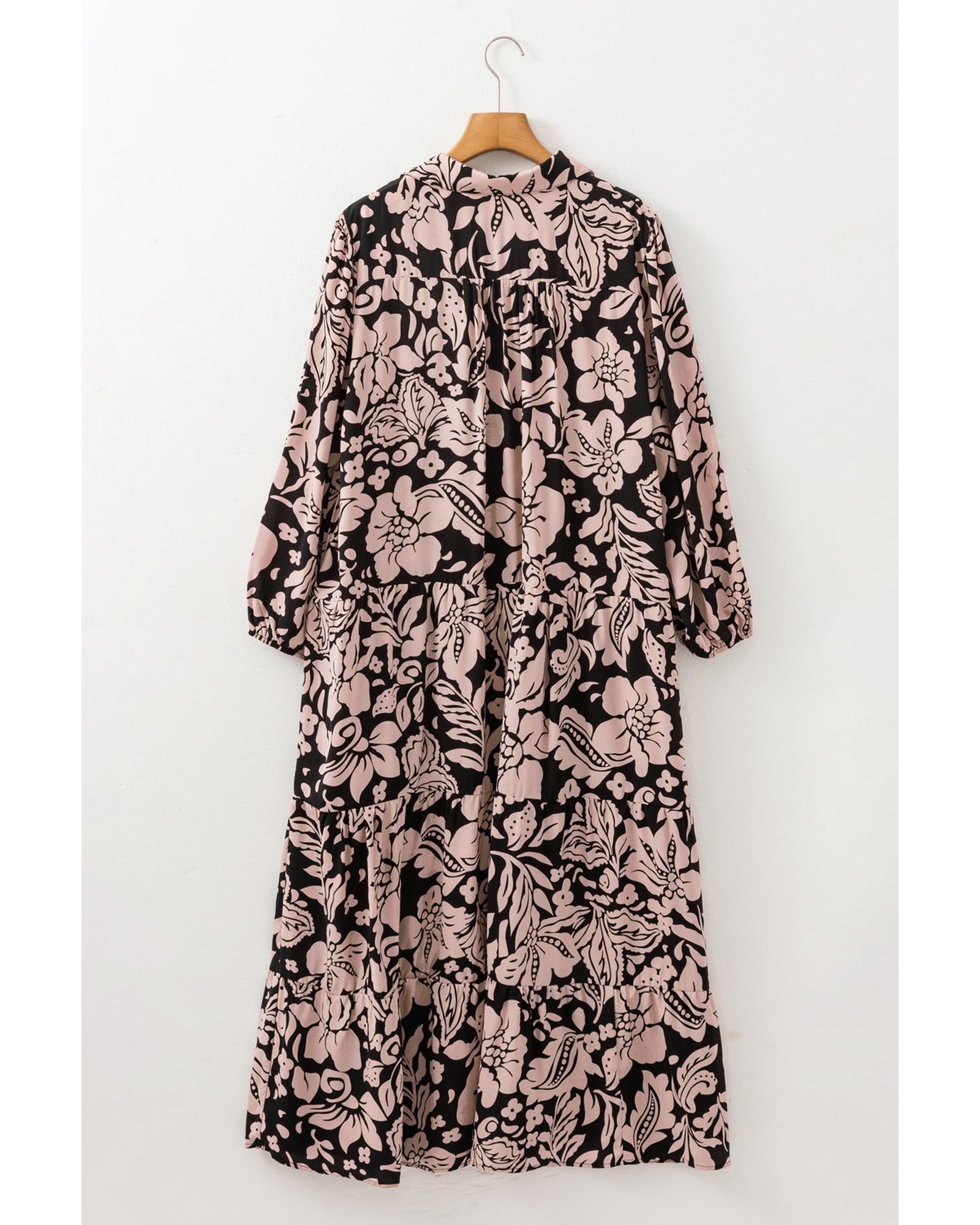 Black Plus Size Floral Printed Puff Sleeve Collared Maxi Dress - 1X