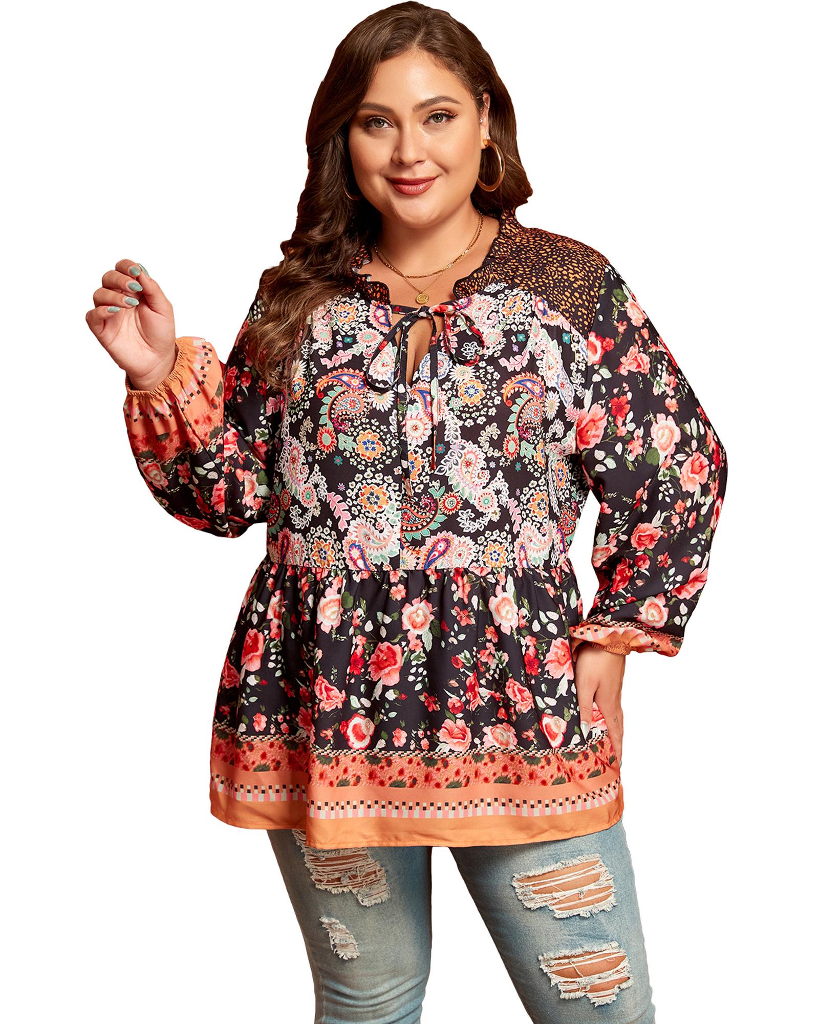 - Black plus size blouse with paisley floral print