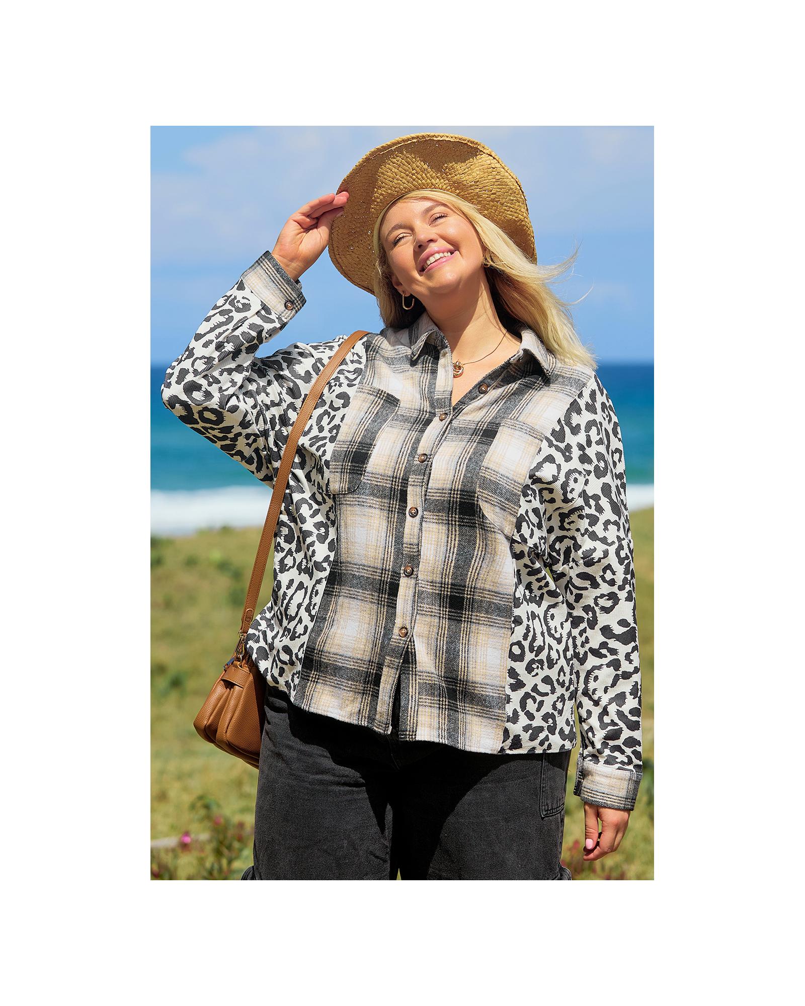This plus size shacket features a trendy plaid leopard patchwork design, combining style and comfort. It is designed to provide a flattering fit with a classic shirt collar and convenient button-up closure, making it suitable for various casual and fashionable looks.