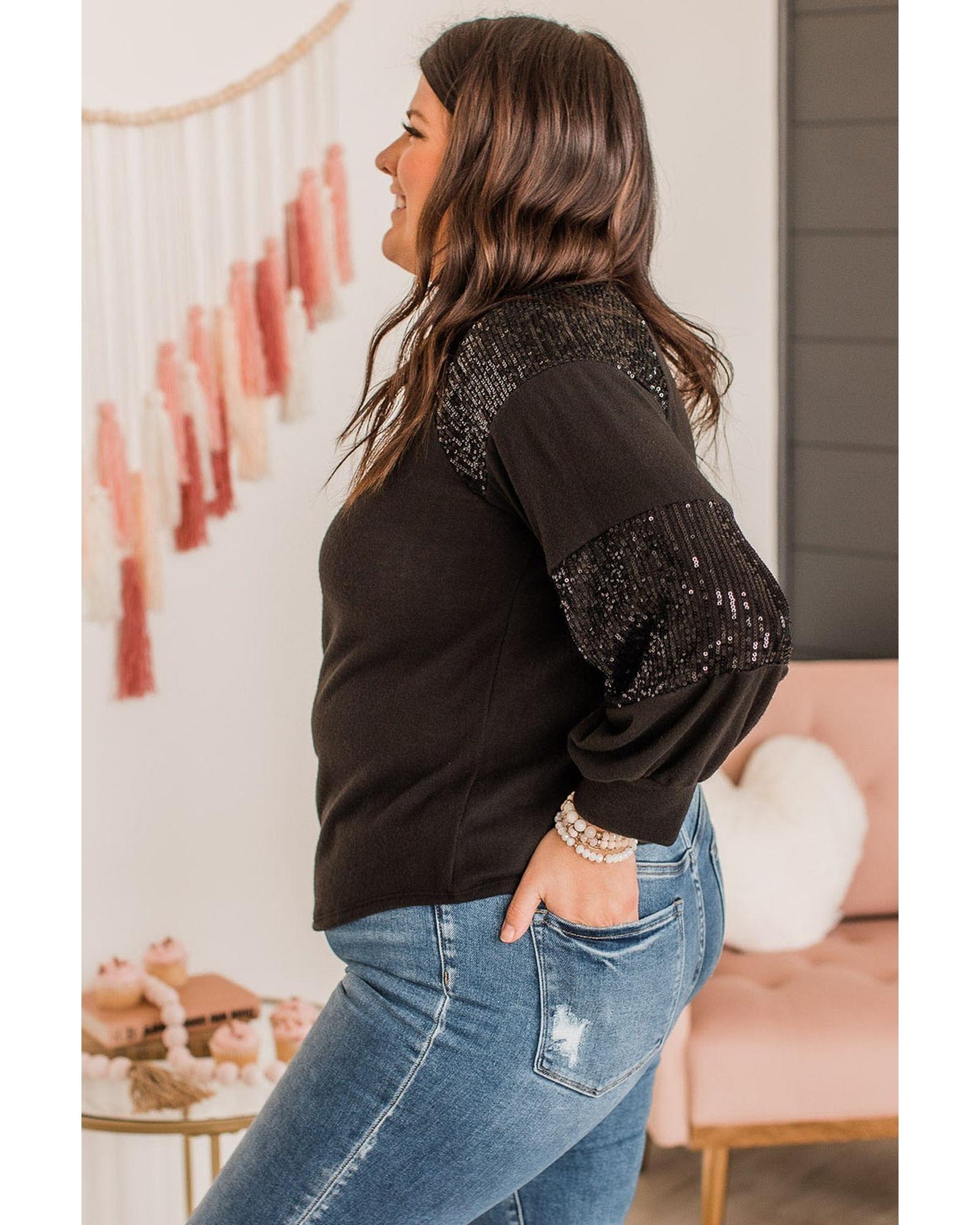 Black Plus Size Sequin Patchwork Crew Neck Long Sleeve Top – 3X
