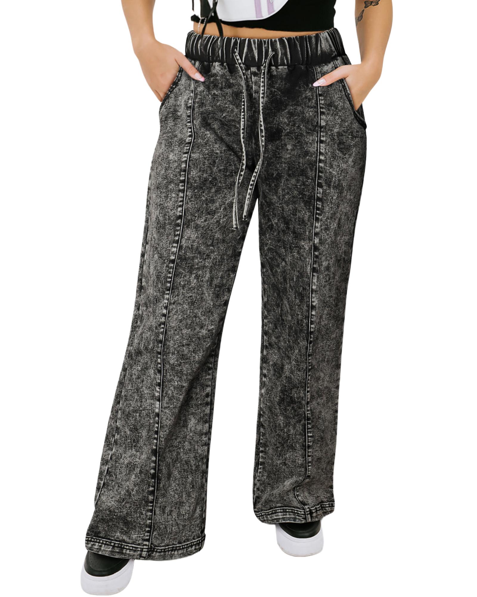 Black Plus Size Tie Dye Drawstring Splicing Wide Leg Jeans – 1X