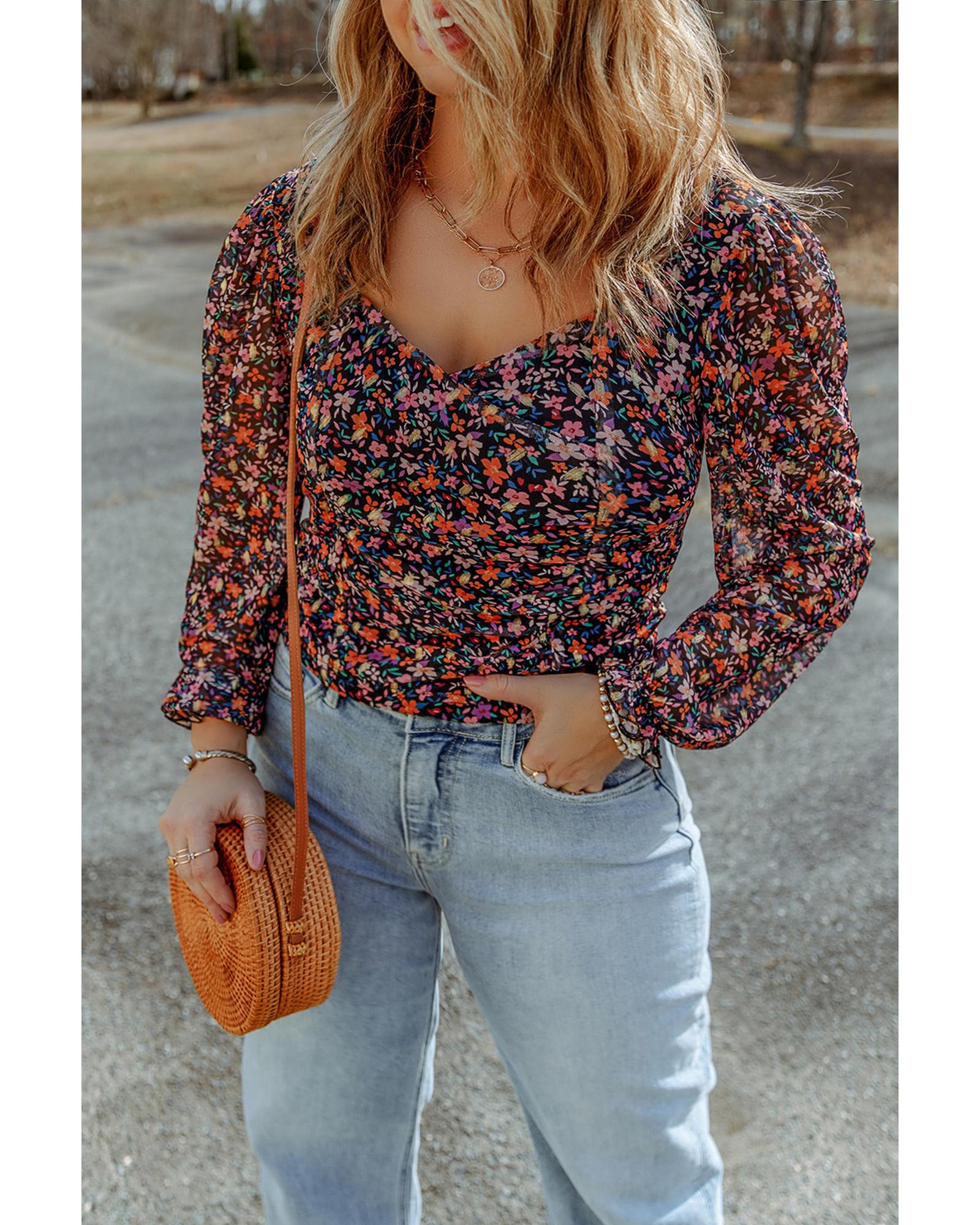 Black Plus Size V Neck Bubble Sleeve Floral Blouse – 3X