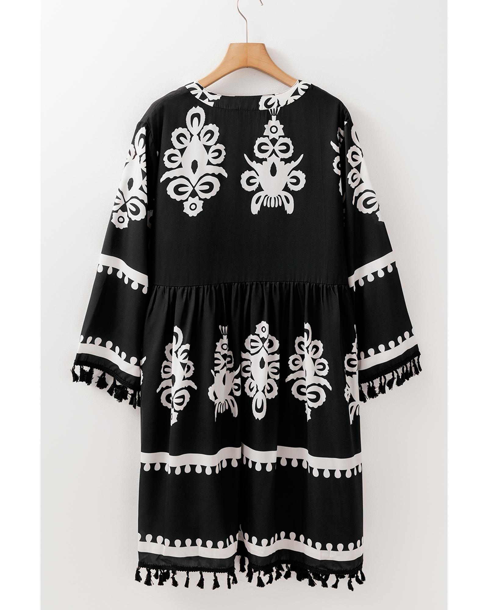 This plus size western floral print dress features a stylish fringed V neckline and bracelet sleeves, combining comfort with a trendy, fitted silhouette. Designed to provide a chic and versatile look, it is suitable for various occasions and offers a unique fashion statement.