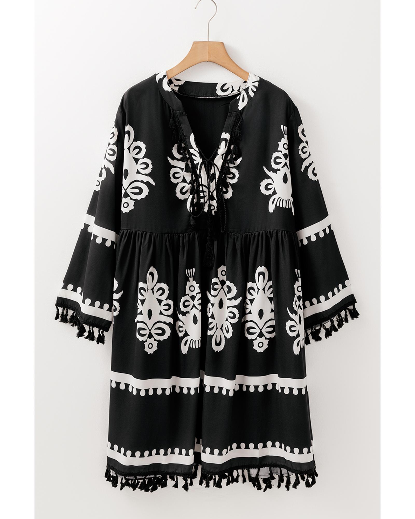 This plus size western floral print dress features a stylish fringed V neckline and bracelet sleeves, offering a comfortable and chic fit. Designed with a trendy fitted silhouette, it combines playful detailing with versatile styling options, making it suitable for various occasions.