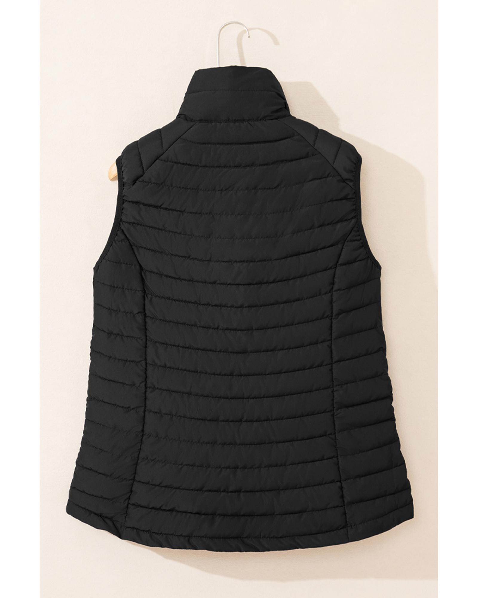 This black plush collared quilted puffer vest combines warmth and style with a trendy, fitted design. Its sleeveless construction makes it versatile for layering, while the puffer style provides added insulation. The zip closure ensures easy wear and a sleek appearance, making it a fashionable addition to any wardrobe.