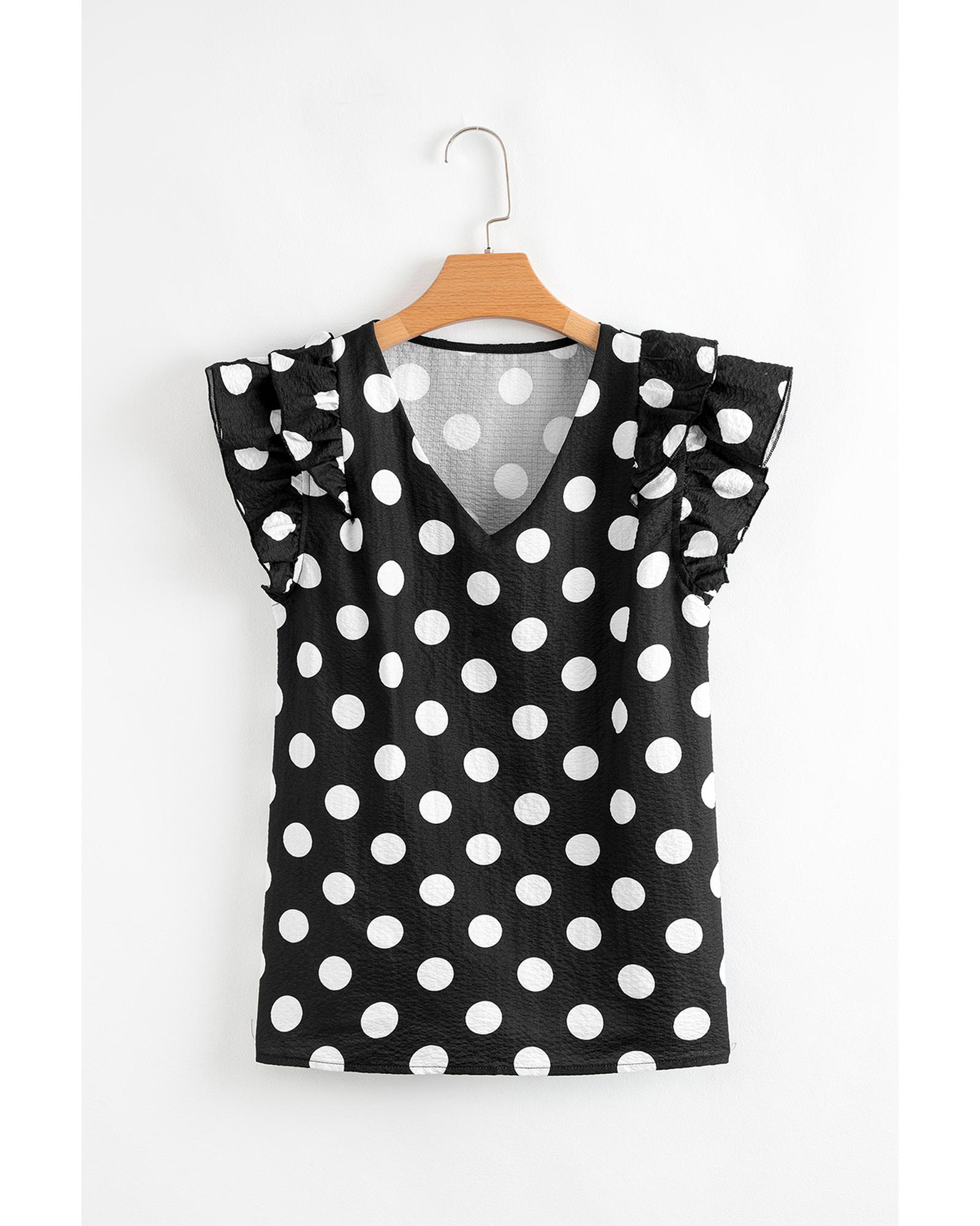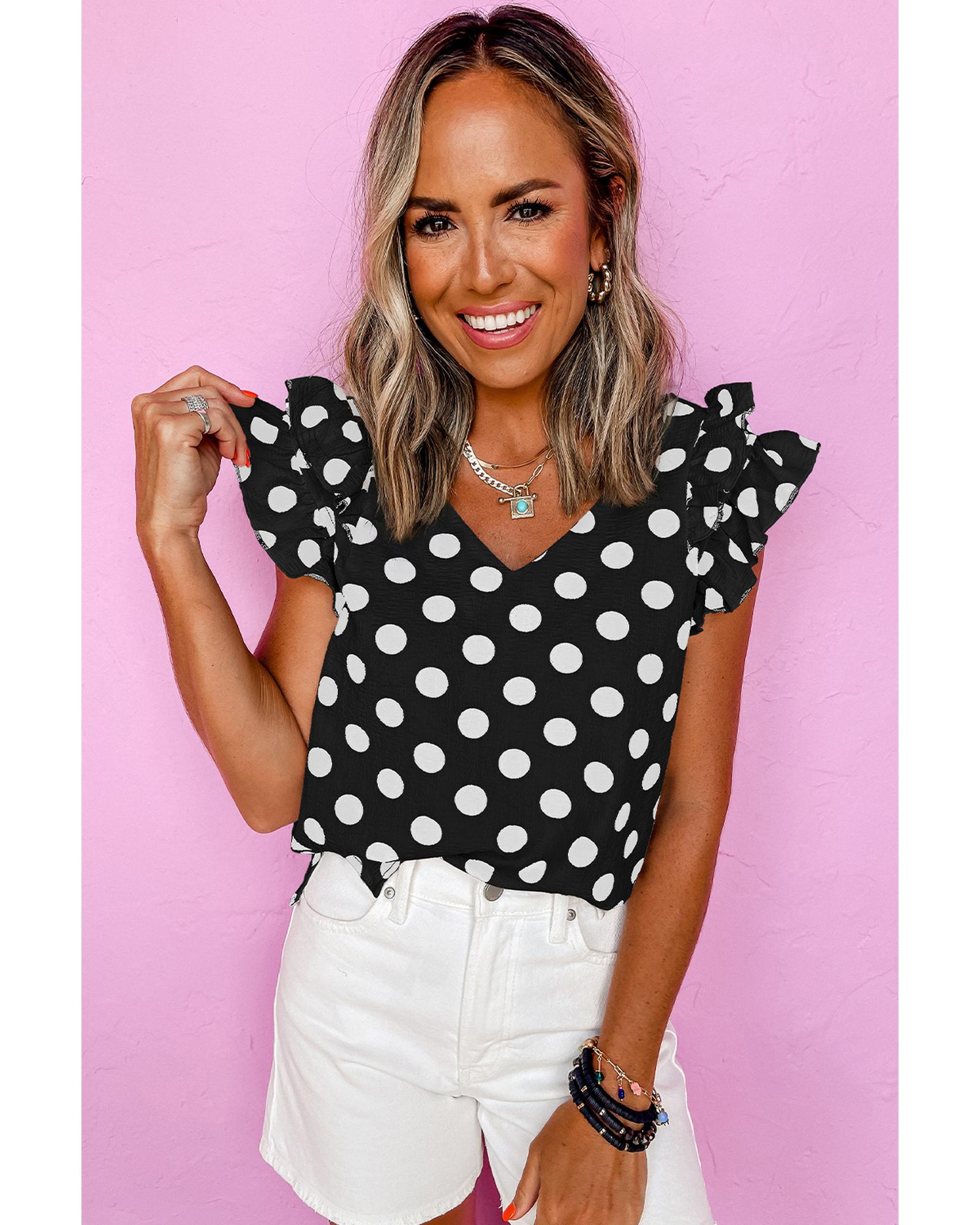 This blouse features a playful polka dot print and a feminine V neckline, making it a versatile addition to any wardrobe. The flowy ruffled sleeves add a chic and playful touch, suitable for both casual and dressy occasions.