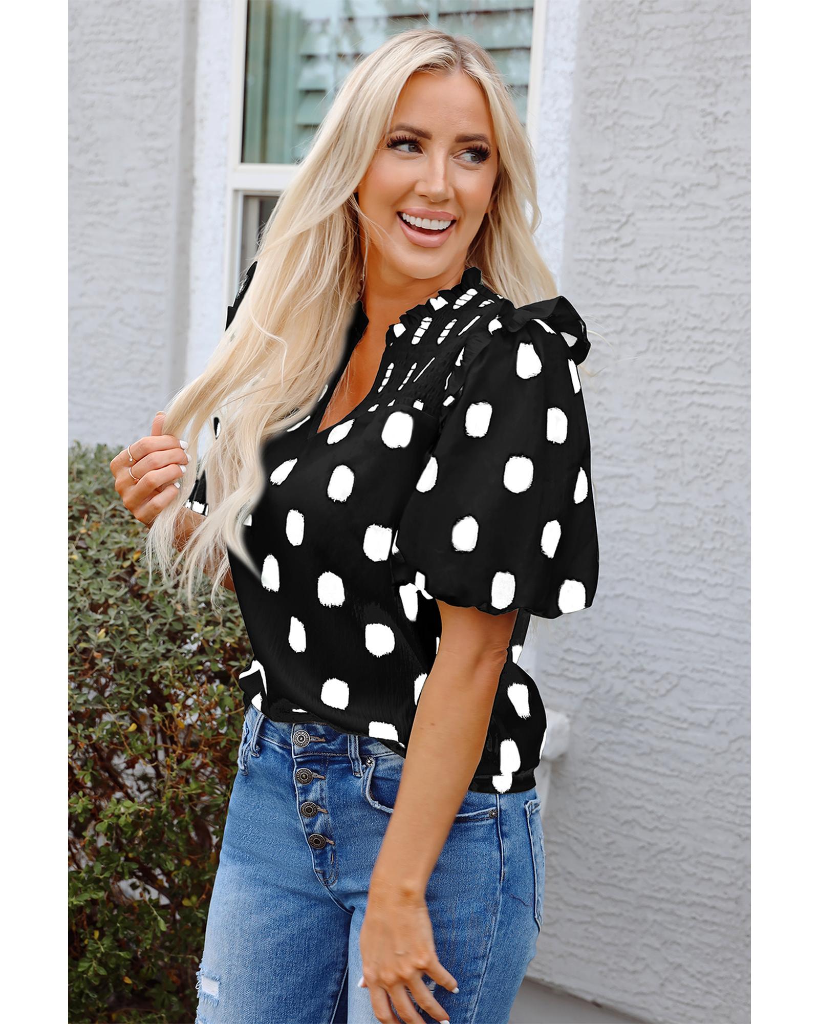 This blouse features a classic black polka dot print with a stylish shirred yoke design. It has a notched v-neck with a frilled collar and ruffles on the shoulders, complemented by balloon sleeves for a fashionable look. The blouse is made from 100% polyester, offering a comfortable fit without elasticity.
