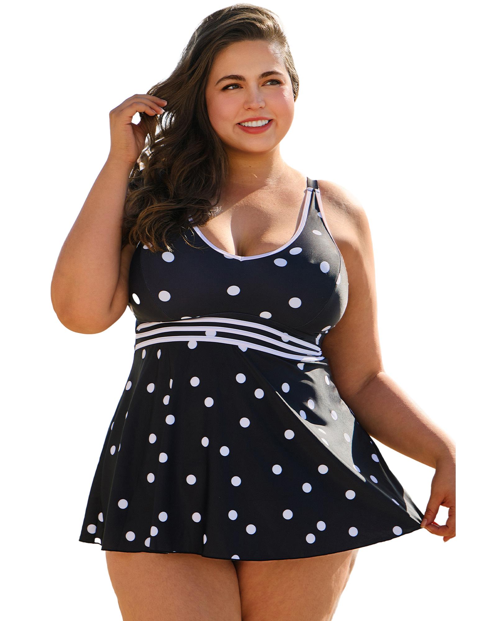 This swim dress features a stylish black polka dot trim with a V neckline, designed for plus size figures. It combines a playful design with a comfortable fit, making it suitable for various body types. The quick-dry fabric ensures convenience and comfort during wear.