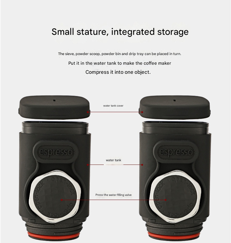 To use, add ground coffee into the powder bowl, place the water filter mesh and filter basket, attach to the water tank, fill with hot water, open the valve, and press to extract the coffee. The result is a delicious espresso ready to enjoy.