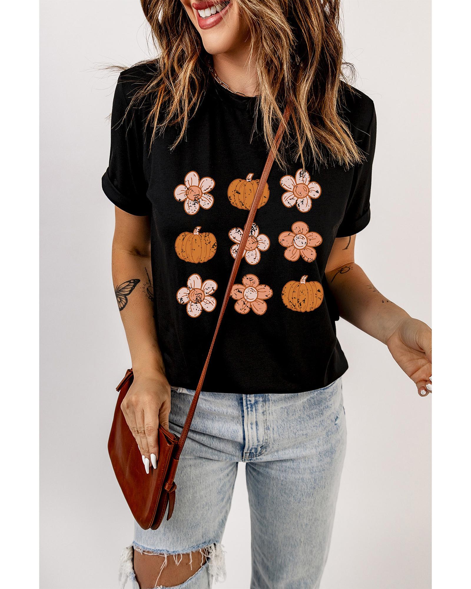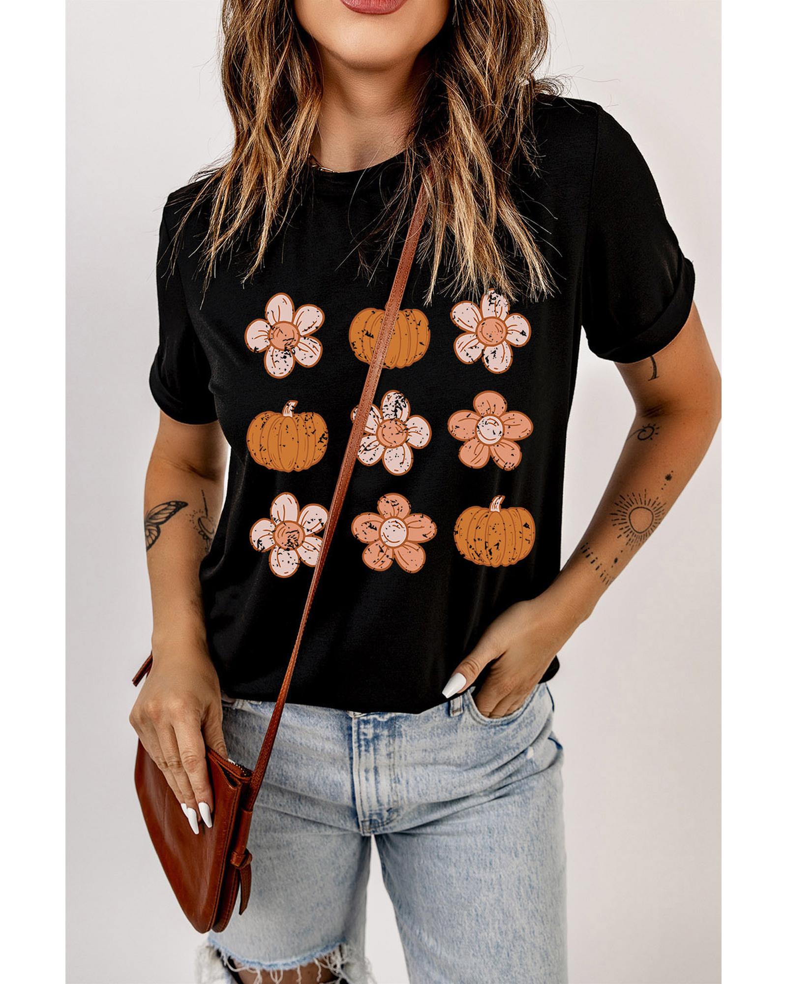 This stylish short sleeve graphic top features a unique pumpkin flower print, offering a trendy and feminine look. Made with high-quality materials, it provides a comfortable fit and a flattering silhouette. Suitable for both casual and dressier occasions, it is a versatile addition to any wardrobe.