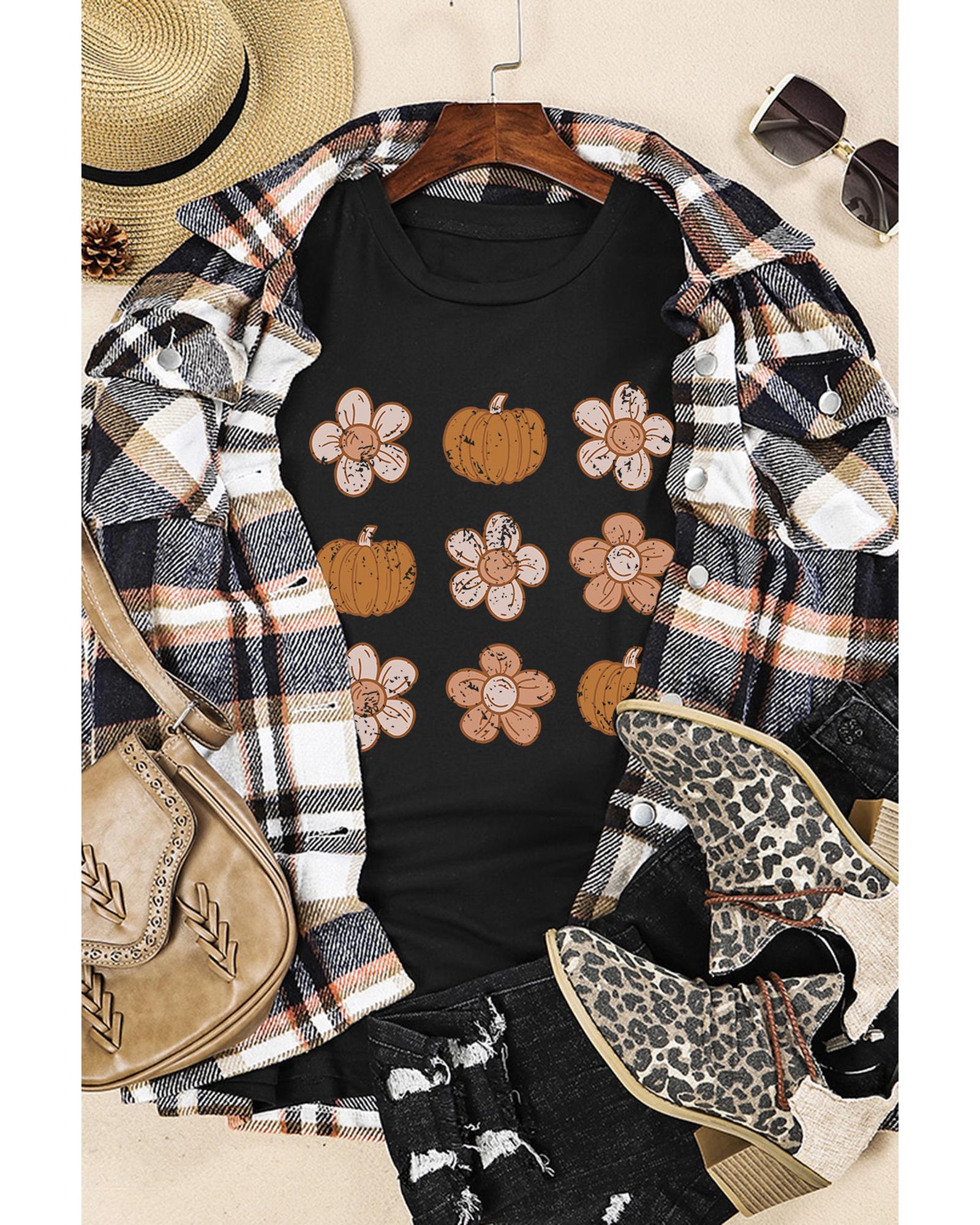 Black Pumpkin Flower Print Short Sleeve Graphic Top – L