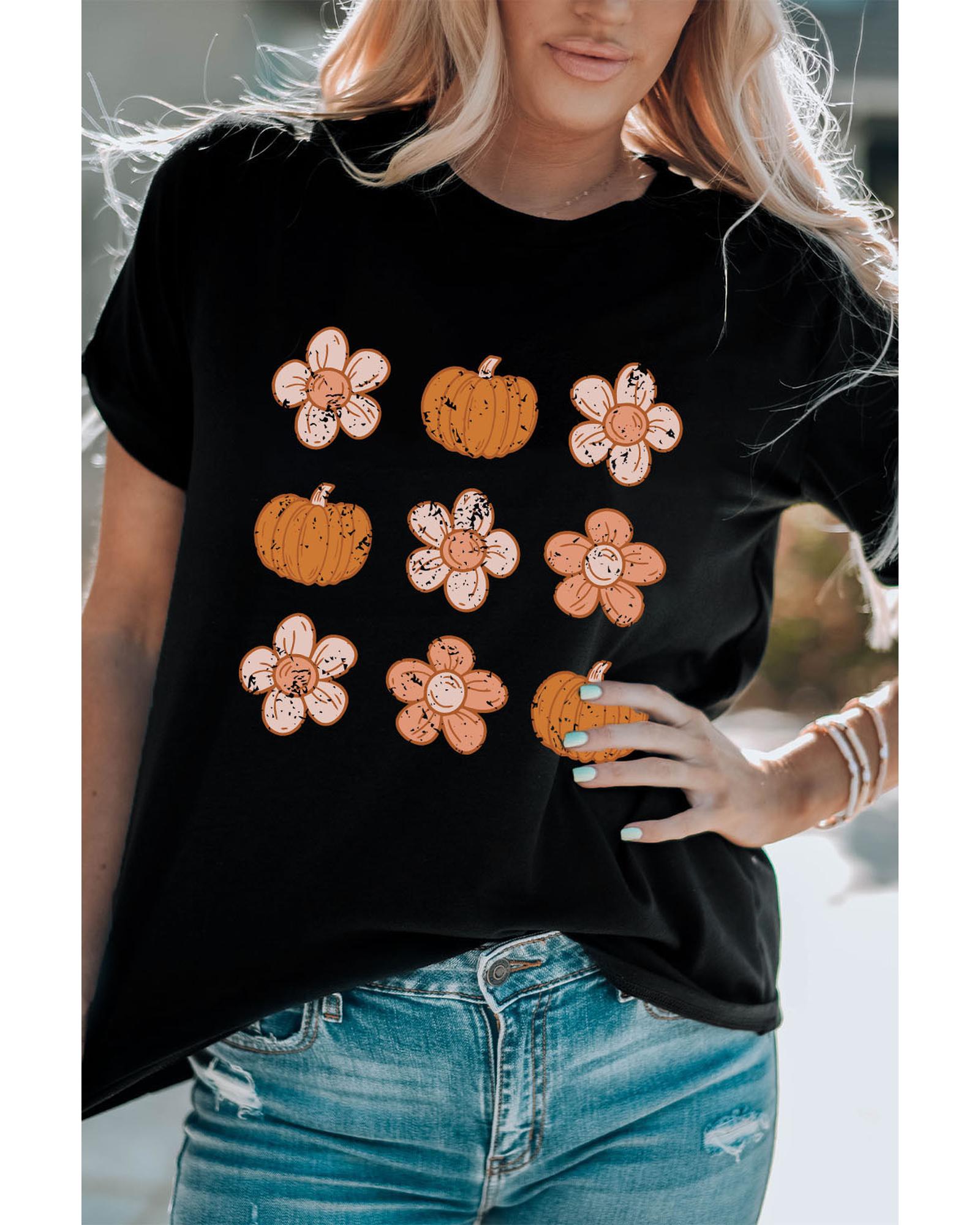 This short sleeve graphic top features a stylish pumpkin flower print, combining trendy design with comfort. Made from high-quality materials, it offers a flattering silhouette and versatile styling options suitable for both casual and dressier occasions.
