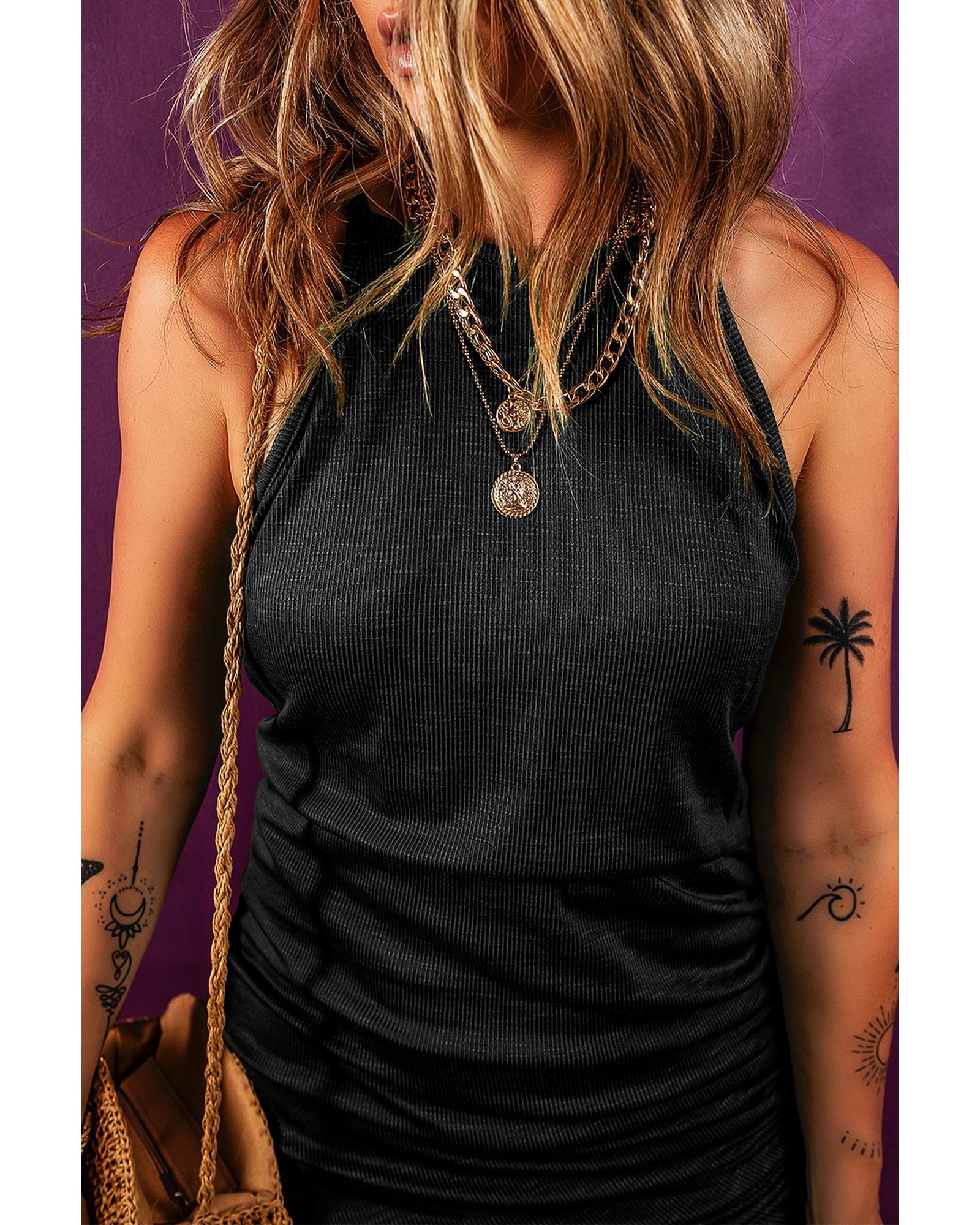 This black racerback ribbed knit dress features a drawstring detail and a bodycon fit that accentuates your curves. Its trendy racerback design and sleeveless style provide a breathable and lightweight feel, making it suitable for various occasions. The dress offers high elasticity for maximum comfort and a flattering silhouette.