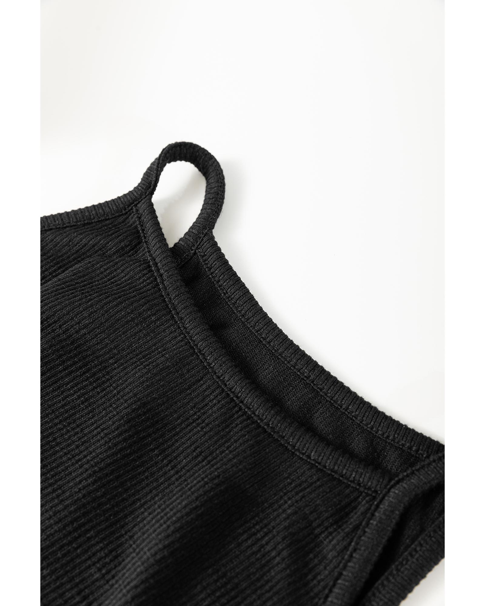This black racerback ribbed knit dress features a drawstring detail and a bodycon silhouette that flatters the figure. The sleeveless design offers a breathable and lightweight feel, making it suitable for various occasions. Crafted with high elasticity, it ensures maximum comfort and a slim fit to accentuate curves.
